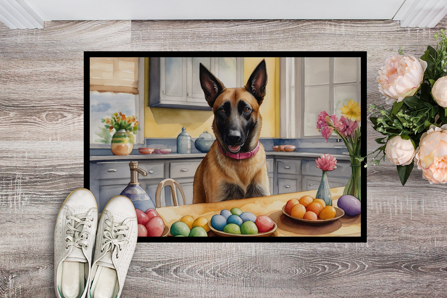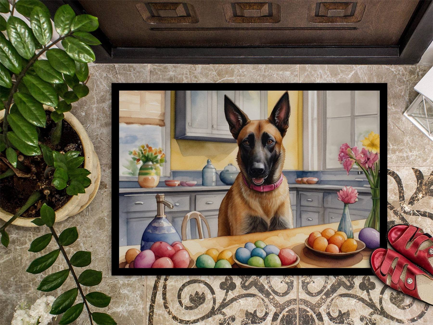 Doormat featuring breed specific Belgian Malinois artwork. Celebrate Easter with this Easter Doormat. Welcome your guests in style with our Artwork Door Mat, designed to withstand almost any weather condition. This mat, measuring approximately 24 by 36 inches, is held together by durable black binding tape. Its top layer, composed of polyester felt, is dyed with the eye-catching image you see on the mat. A few layers below provide the mat with stability, while its rubber bottom is stamped to help prevent slipping and ensures safety. Our mat works wonderfully as both an indoor or outdoor door mat. For cleaning, simply hose it off with water or use a power washer - no need for any cleaner that produces suds. Avoid scrubbing with a brush, instead, opt for the vacuum on floor setting. Designed manufactured and printed in the USA, this mat is a perfect addition to your porch, outdoor kitchen, entryway, or any indoor space. Its unique design makes it a charming decorative rug that greets your guests and adds a stylish touch to your home decor.
