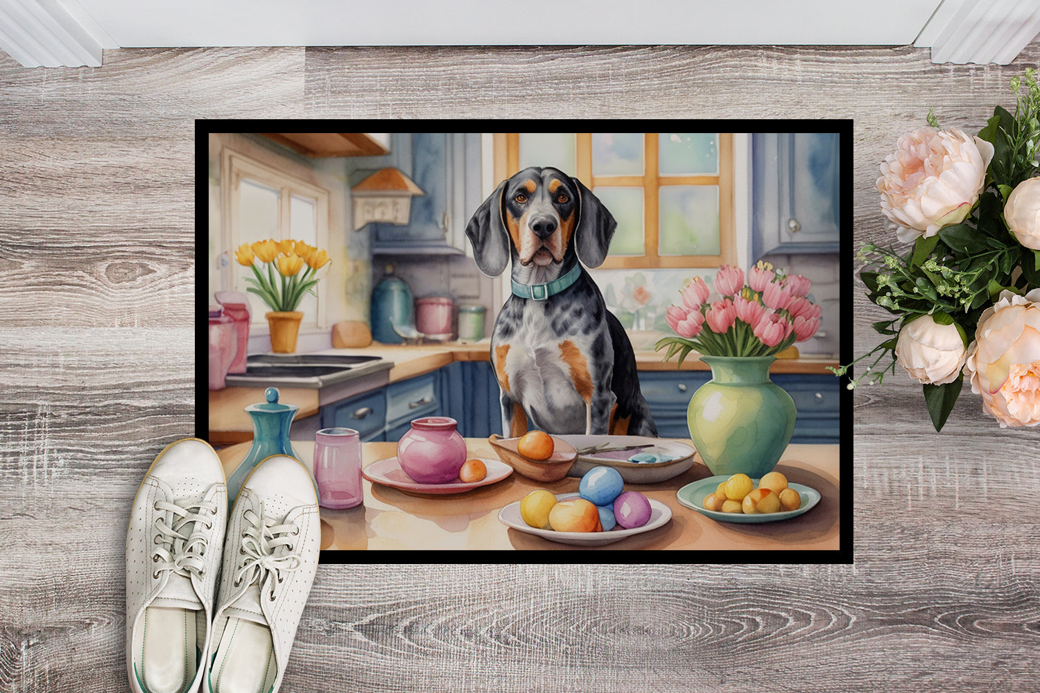 Doormat featuring breed specific Bluetick Coonhound artwork. Celebrate Easter with this Easter Doormat. Welcome your guests in style with our Artwork Door Mat, designed to withstand almost any weather condition. This mat, measuring approximately 24 by 36 inches, is held together by durable black binding tape. Its top layer, composed of polyester felt, is dyed with the eye-catching image you see on the mat. A few layers below provide the mat with stability, while its rubber bottom is stamped to help prevent slipping and ensures safety. Our mat works wonderfully as both an indoor or outdoor door mat. For cleaning, simply hose it off with water or use a power washer - no need for any cleaner that produces suds. Avoid scrubbing with a brush, instead, opt for the vacuum on floor setting. Designed manufactured and printed in the USA, this mat is a perfect addition to your porch, outdoor kitchen, entryway, or any indoor space. Its unique design makes it a charming decorative rug that greets your guests and adds a stylish touch to your home decor.