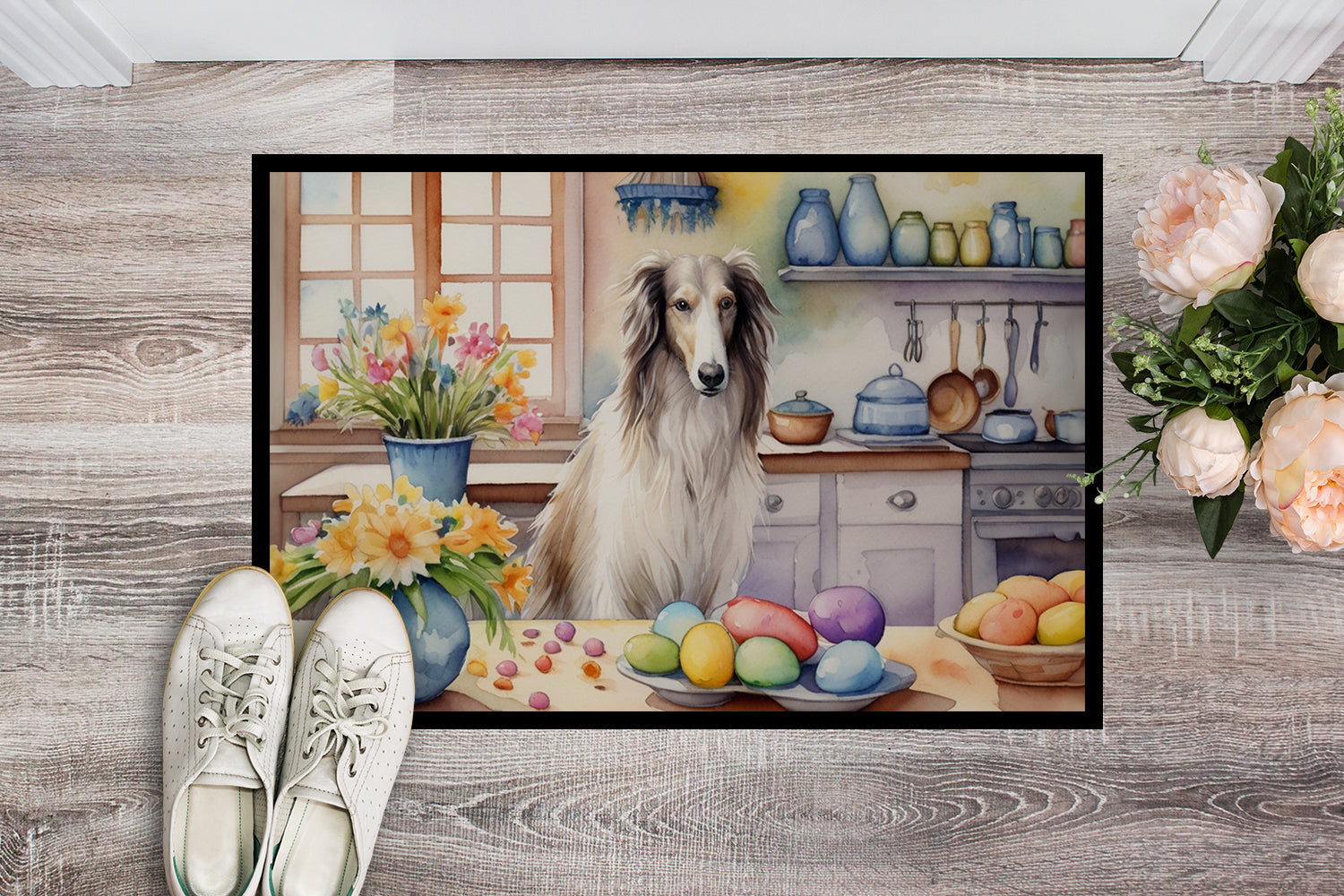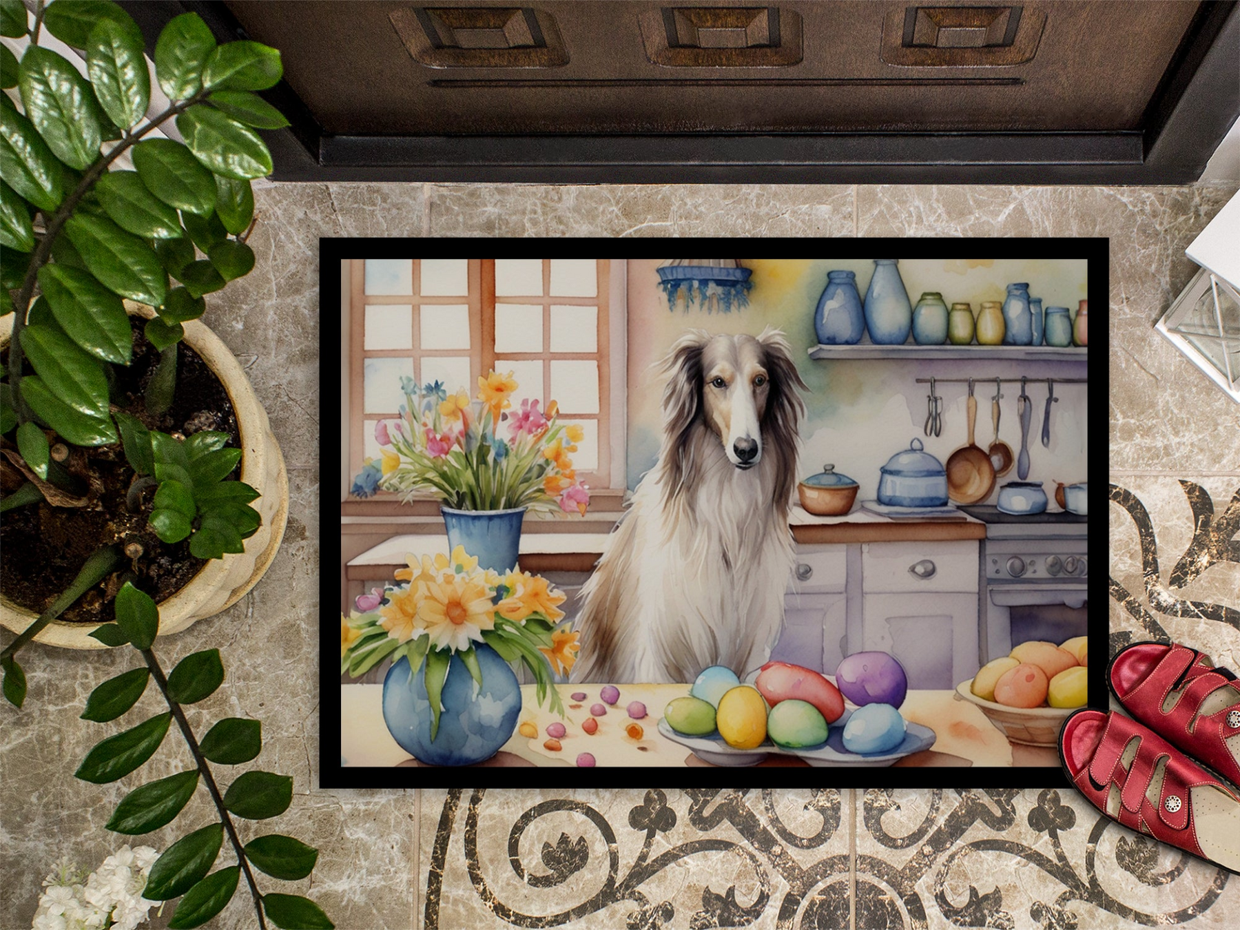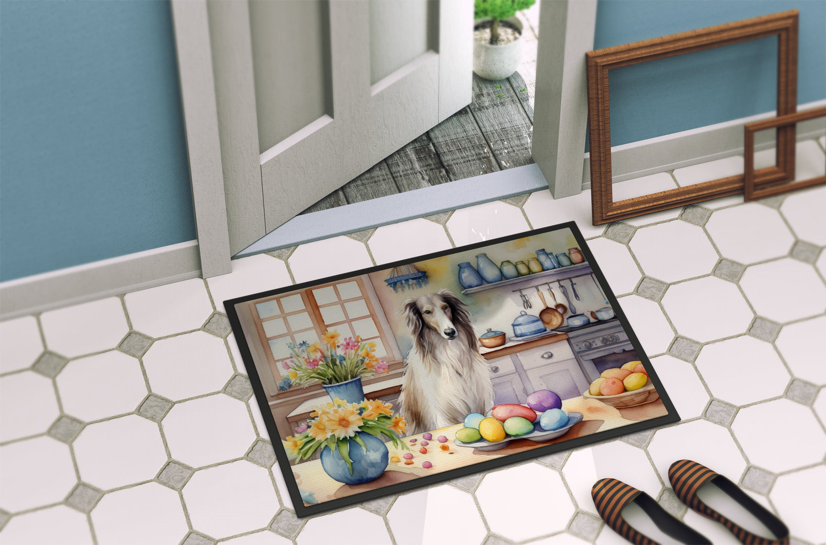 Doormat featuring breed specific Borzoi Russian Wolfhound artwork. Celebrate Easter with this Easter Doormat. Welcome your guests in style with our Artwork Door Mat, designed to withstand almost any weather condition. This mat, measuring approximately 24 by 36 inches, is held together by durable black binding tape. Its top layer, composed of polyester felt, is dyed with the eye-catching image you see on the mat. A few layers below provide the mat with stability, while its rubber bottom is stamped to help prevent slipping and ensures safety. Our mat works wonderfully as both an indoor or outdoor door mat. For cleaning, simply hose it off with water or use a power washer - no need for any cleaner that produces suds. Avoid scrubbing with a brush, instead, opt for the vacuum on floor setting. Designed manufactured and printed in the USA, this mat is a perfect addition to your porch, outdoor kitchen, entryway, or any indoor space. Its unique design makes it a charming decorative rug that greets your guests and adds a stylish touch to your home decor.