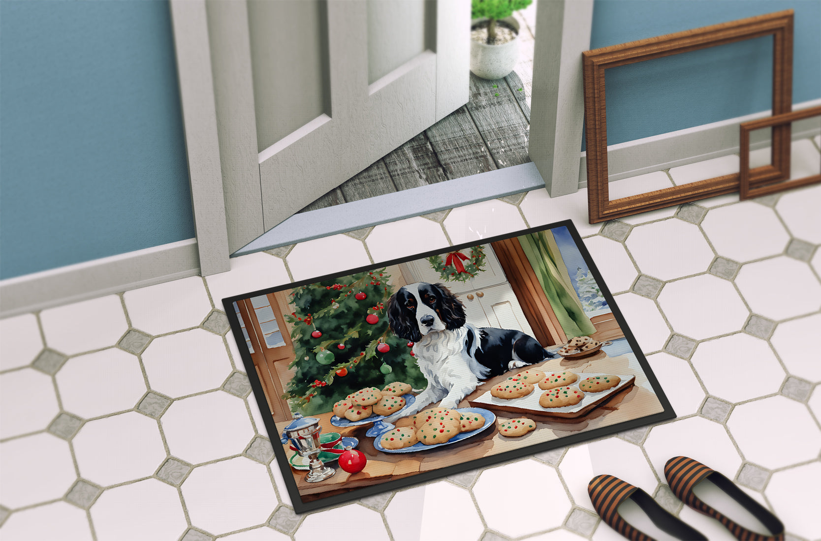 Doormat featuring breed specific English Springer Spaniel artwork. Celebrate Christmas with this Christmas Doormat. Welcome your guests in style with our Artwork Door Mat, designed to withstand almost any weather condition. This mat, measuring approximately 24 by 36 inches, is held together by durable black binding tape. Its top layer, composed of polyester felt, is dyed with the eye-catching image you see on the mat. A few layers below provide the mat with stability, while its rubber bottom is stamped to help prevent slipping and ensures safety. Our mat works wonderfully as both an indoor or outdoor door mat. For cleaning, simply hose it off with water or use a power washer - no need for any cleaner that produces suds. Avoid scrubbing with a brush, instead, opt for the vacuum on floor setting. Designed manufactured and printed in the USA, this mat is a perfect addition to your porch, outdoor kitchen, entryway, or any indoor space. Its unique design makes it a charming decorative rug that greets your guests and adds a stylish touch to your home decor.