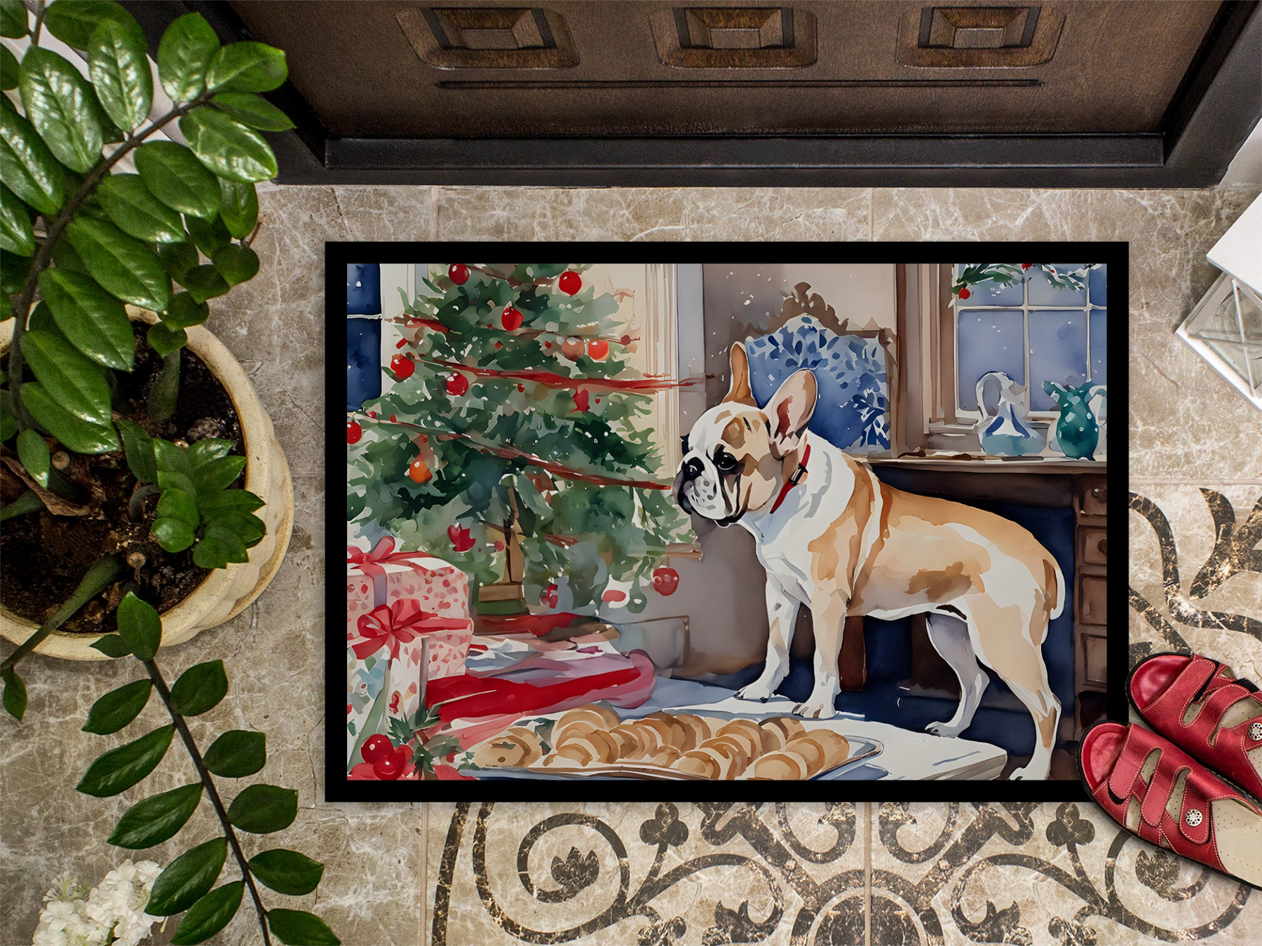 Doormat featuring breed specific French Bulldog artwork. Celebrate Christmas with this Christmas Doormat. Welcome your guests in style with our Artwork Door Mat, designed to withstand almost any weather condition. This mat, measuring approximately 24 by 36 inches, is held together by durable black binding tape. Its top layer, composed of polyester felt, is dyed with the eye-catching image you see on the mat. A few layers below provide the mat with stability, while its rubber bottom is stamped to help prevent slipping and ensures safety. Our mat works wonderfully as both an indoor or outdoor door mat. For cleaning, simply hose it off with water or use a power washer - no need for any cleaner that produces suds. Avoid scrubbing with a brush, instead, opt for the vacuum on floor setting. Designed manufactured and printed in the USA, this mat is a perfect addition to your porch, outdoor kitchen, entryway, or any indoor space. Its unique design makes it a charming decorative rug that greets your guests and adds a stylish touch to your home decor.