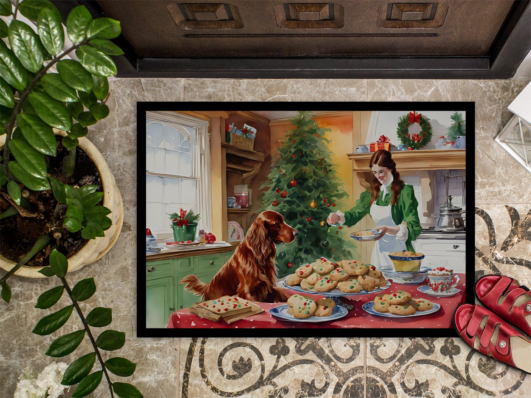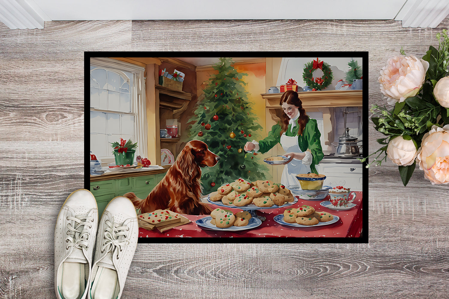 Doormat featuring breed specific Irish Setter artwork. Celebrate Christmas with this Christmas Doormat. Welcome your guests in style with our Artwork Door Mat, designed to withstand almost any weather condition. This mat, measuring approximately 24 by 36 inches, is held together by durable black binding tape. Its top layer, composed of polyester felt, is dyed with the eye-catching image you see on the mat. A few layers below provide the mat with stability, while its rubber bottom is stamped to help prevent slipping and ensures safety. Our mat works wonderfully as both an indoor or outdoor door mat. For cleaning, simply hose it off with water or use a power washer - no need for any cleaner that produces suds. Avoid scrubbing with a brush, instead, opt for the vacuum on floor setting. Designed manufactured and printed in the USA, this mat is a perfect addition to your porch, outdoor kitchen, entryway, or any indoor space. Its unique design makes it a charming decorative rug that greets your guests and adds a stylish touch to your home decor.