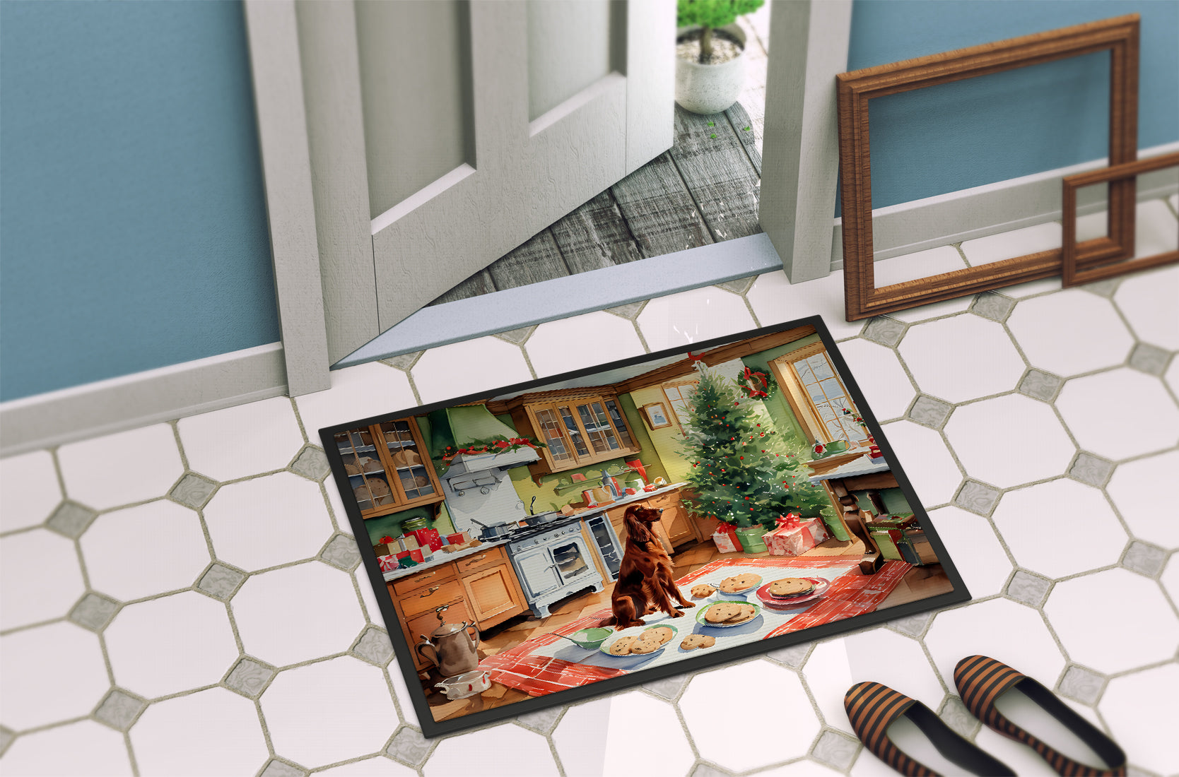 Doormat featuring breed specific Irish Setter artwork. Celebrate Christmas with this Christmas Doormat. Welcome your guests in style with our Artwork Door Mat, designed to withstand almost any weather condition. This mat, measuring approximately 24 by 36 inches, is held together by durable black binding tape. Its top layer, composed of polyester felt, is dyed with the eye-catching image you see on the mat. A few layers below provide the mat with stability, while its rubber bottom is stamped to help prevent slipping and ensures safety. Our mat works wonderfully as both an indoor or outdoor door mat. For cleaning, simply hose it off with water or use a power washer - no need for any cleaner that produces suds. Avoid scrubbing with a brush, instead, opt for the vacuum on floor setting. Designed manufactured and printed in the USA, this mat is a perfect addition to your porch, outdoor kitchen, entryway, or any indoor space. Its unique design makes it a charming decorative rug that greets your guests and adds a stylish touch to your home decor.