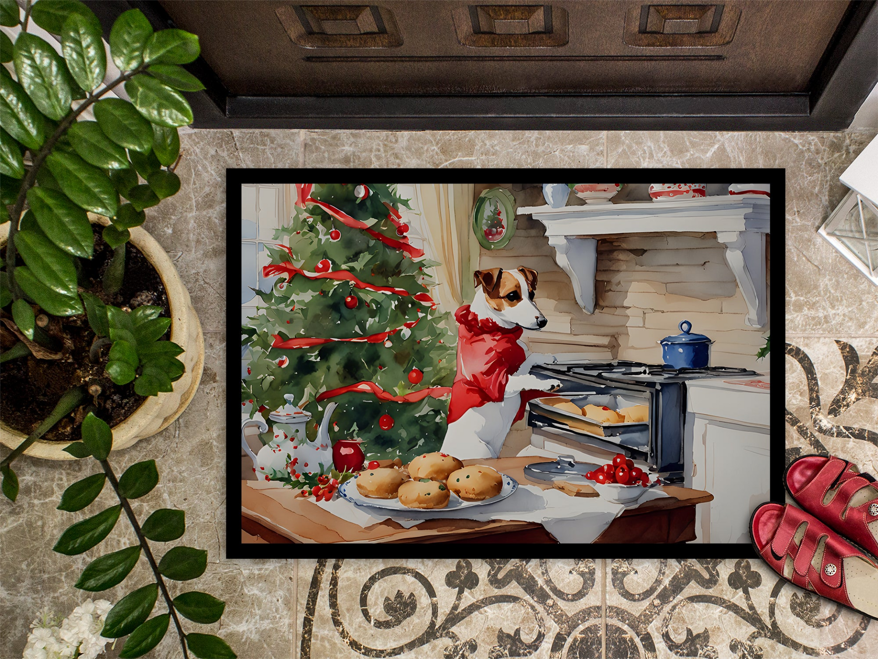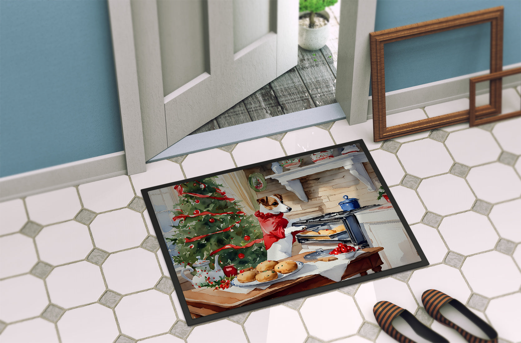 Doormat featuring breed specific Jack Russell Terrier artwork. Celebrate Christmas with this Christmas Doormat. Welcome your guests in style with our Artwork Door Mat, designed to withstand almost any weather condition. This mat, measuring approximately 24 by 36 inches, is held together by durable black binding tape. Its top layer, composed of polyester felt, is dyed with the eye-catching image you see on the mat. A few layers below provide the mat with stability, while its rubber bottom is stamped to help prevent slipping and ensures safety. Our mat works wonderfully as both an indoor or outdoor door mat. For cleaning, simply hose it off with water or use a power washer - no need for any cleaner that produces suds. Avoid scrubbing with a brush, instead, opt for the vacuum on floor setting. Designed manufactured and printed in the USA, this mat is a perfect addition to your porch, outdoor kitchen, entryway, or any indoor space. Its unique design makes it a charming decorative rug that greets your guests and adds a stylish touch to your home decor.