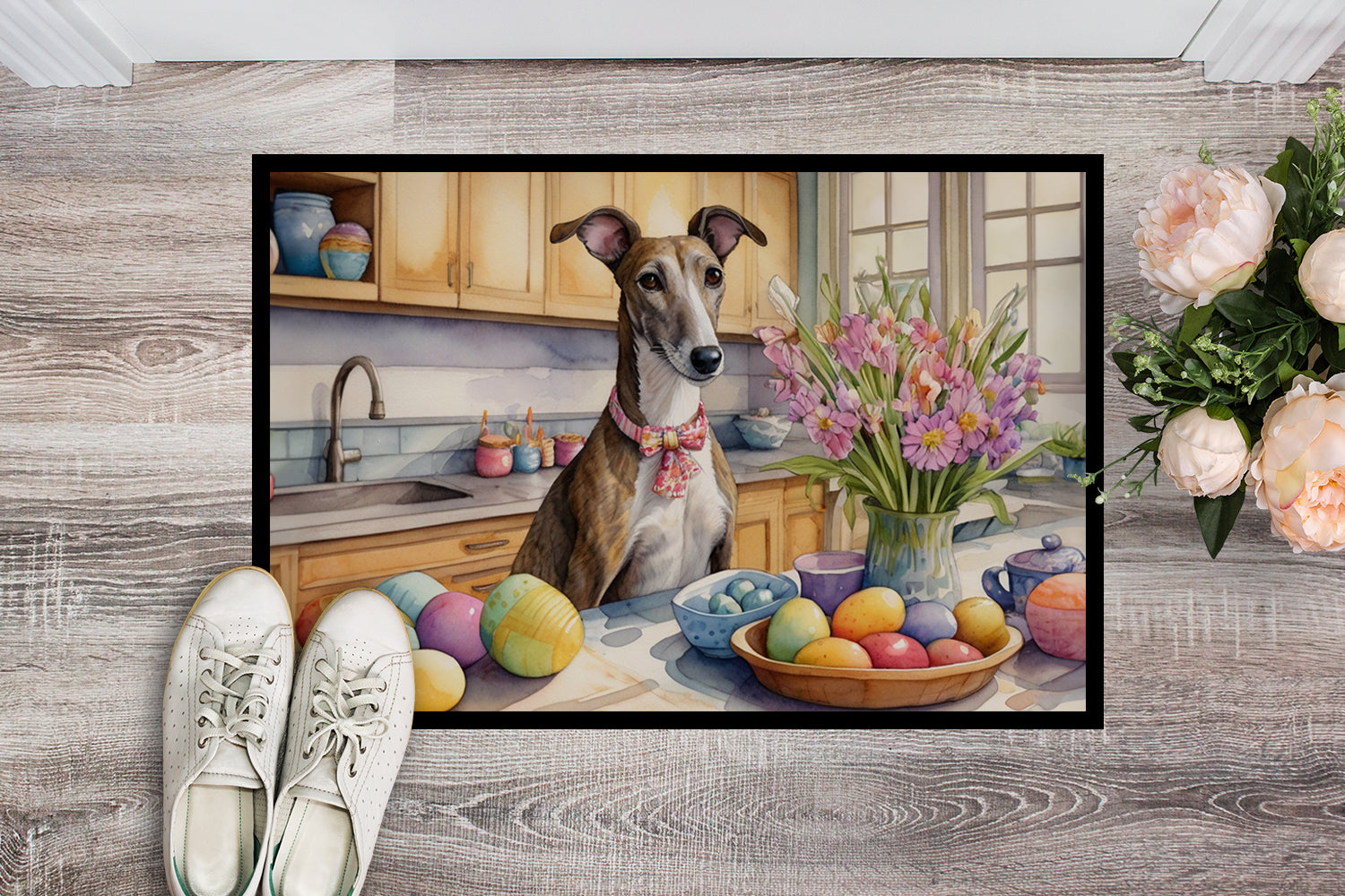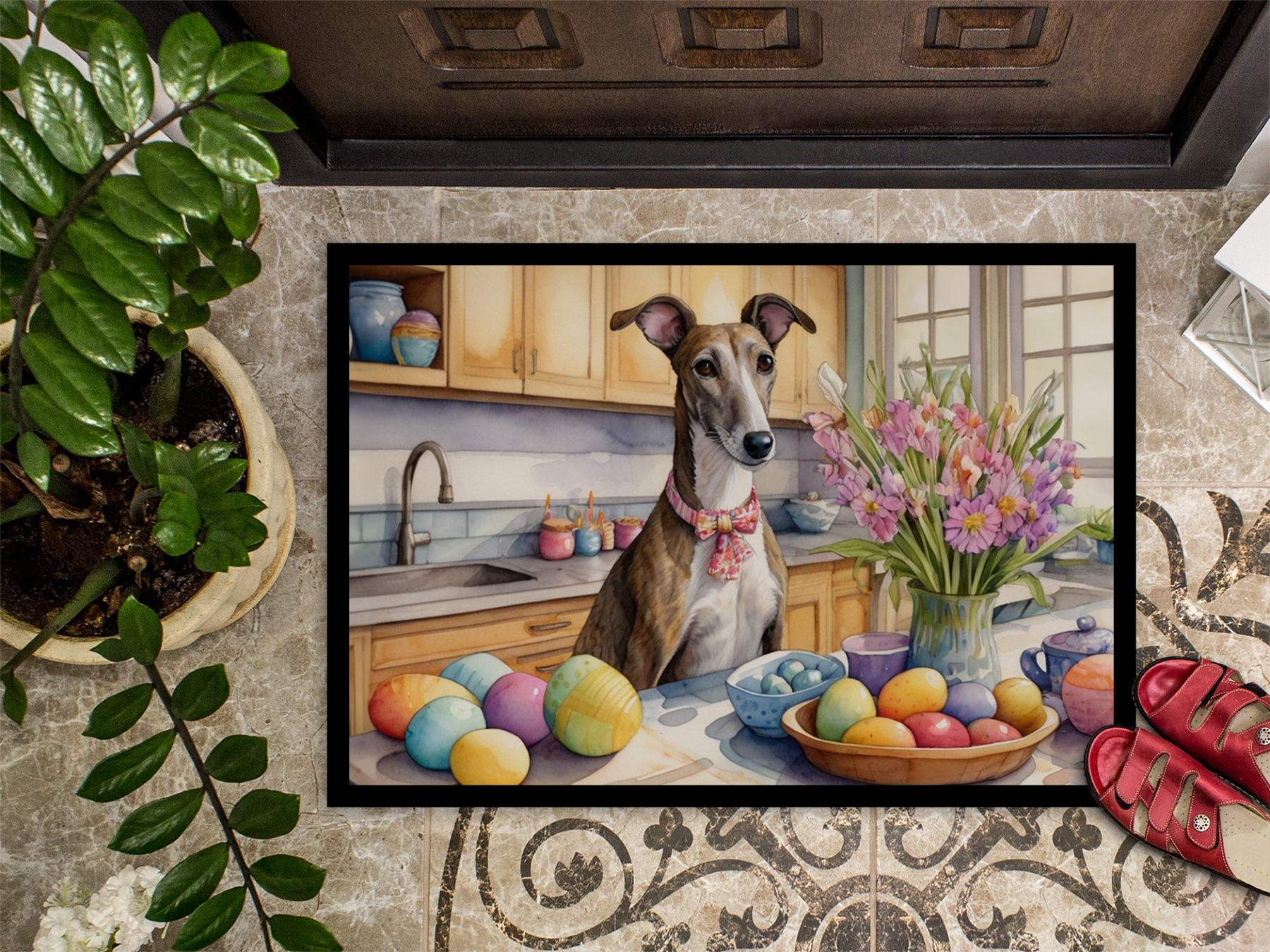 Doormat featuring breed specific Greyhound artwork. Celebrate Easter with this Easter Doormat. Welcome your guests in style with our Artwork Door Mat, designed to withstand almost any weather condition. This mat, measuring approximately 24 by 36 inches, is held together by durable black binding tape. Its top layer, composed of polyester felt, is dyed with the eye-catching image you see on the mat. A few layers below provide the mat with stability, while its rubber bottom is stamped to help prevent slipping and ensures safety. Our mat works wonderfully as both an indoor or outdoor door mat. For cleaning, simply hose it off with water or use a power washer - no need for any cleaner that produces suds. Avoid scrubbing with a brush, instead, opt for the vacuum on floor setting. Designed manufactured and printed in the USA, this mat is a perfect addition to your porch, outdoor kitchen, entryway, or any indoor space. Its unique design makes it a charming decorative rug that greets your guests and adds a stylish touch to your home decor.