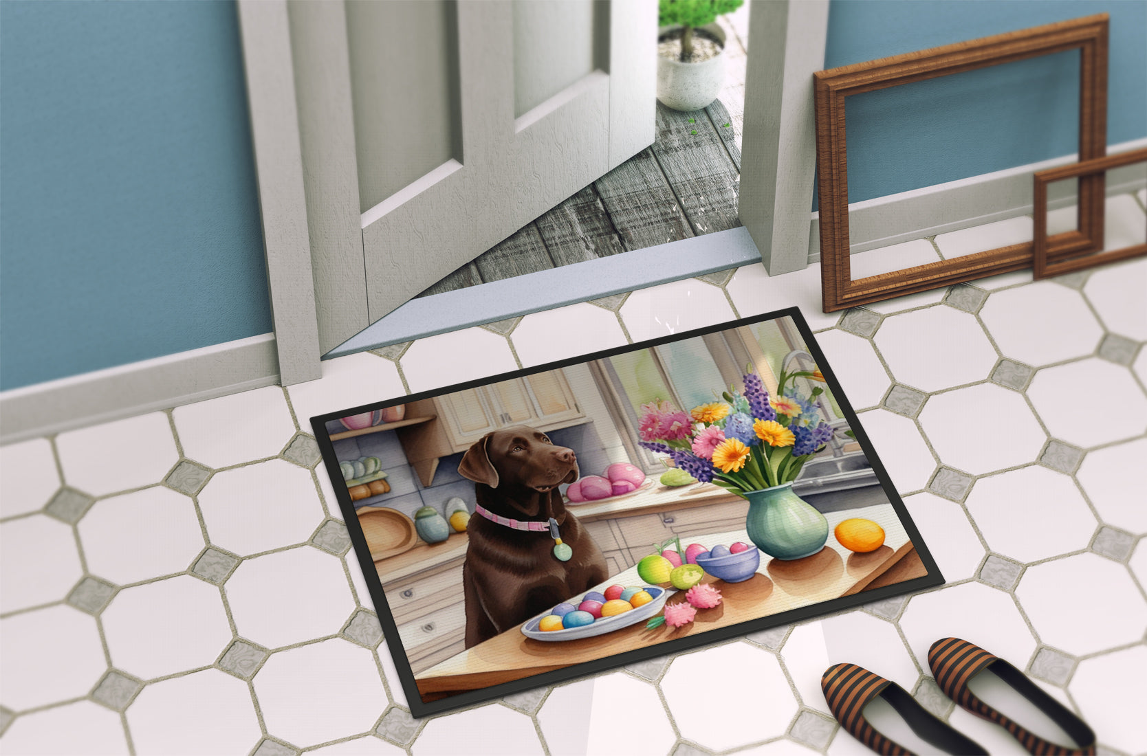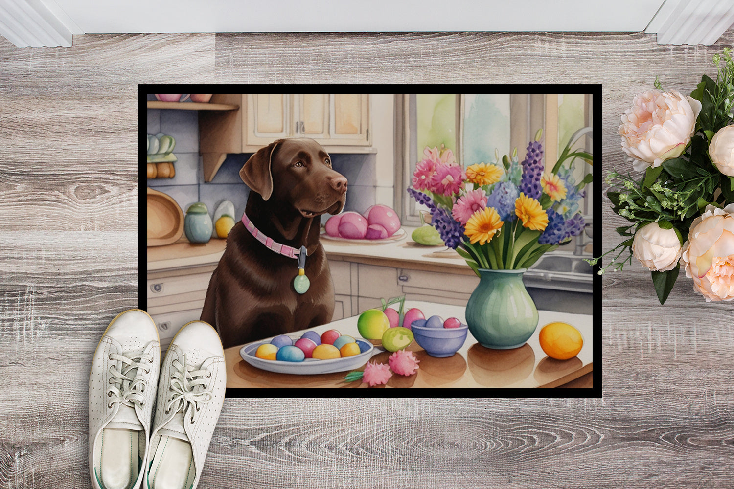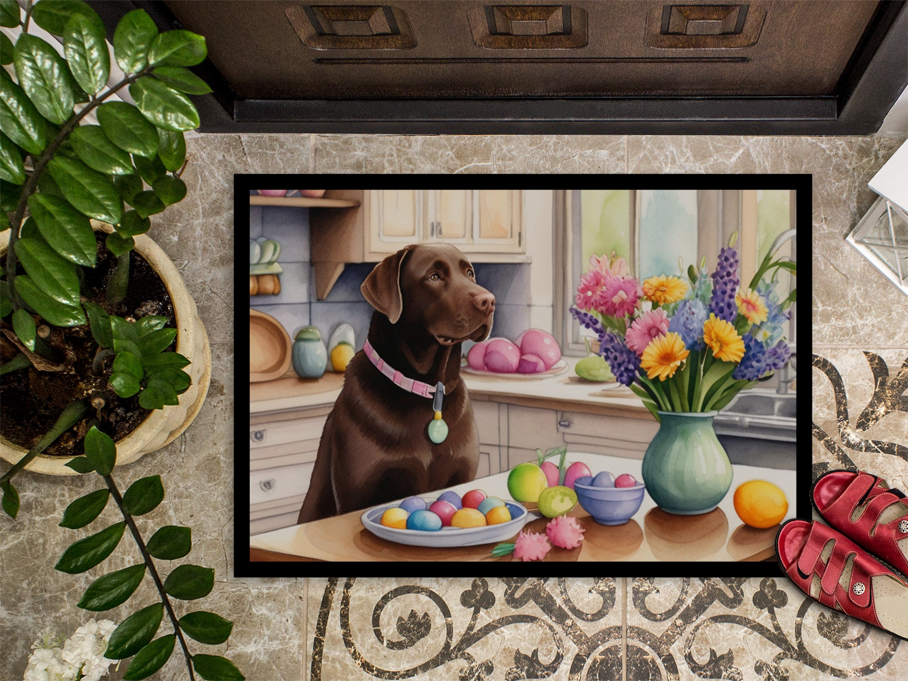 Doormat featuring breed specific Labrador Retriever artwork. Celebrate Easter with this Easter Doormat. Welcome your guests in style with our Artwork Door Mat, designed to withstand almost any weather condition. This mat, measuring approximately 24 by 36 inches, is held together by durable black binding tape. Its top layer, composed of polyester felt, is dyed with the eye-catching image you see on the mat. A few layers below provide the mat with stability, while its rubber bottom is stamped to help prevent slipping and ensures safety. Our mat works wonderfully as both an indoor or outdoor door mat. For cleaning, simply hose it off with water or use a power washer - no need for any cleaner that produces suds. Avoid scrubbing with a brush, instead, opt for the vacuum on floor setting. Designed manufactured and printed in the USA, this mat is a perfect addition to your porch, outdoor kitchen, entryway, or any indoor space. Its unique design makes it a charming decorative rug that greets your guests and adds a stylish touch to your home decor.