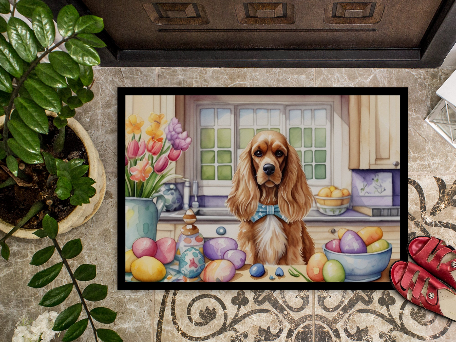 Doormat featuring breed specific Cocker Spaniel artwork. Celebrate Easter with this Easter Doormat. Welcome your guests in style with our Artwork Door Mat, designed to withstand almost any weather condition. This mat, measuring approximately 24 by 36 inches, is held together by durable black binding tape. Its top layer, composed of polyester felt, is dyed with the eye-catching image you see on the mat. A few layers below provide the mat with stability, while its rubber bottom is stamped to help prevent slipping and ensures safety. Our mat works wonderfully as both an indoor or outdoor door mat. For cleaning, simply hose it off with water or use a power washer - no need for any cleaner that produces suds. Avoid scrubbing with a brush, instead, opt for the vacuum on floor setting. Designed manufactured and printed in the USA, this mat is a perfect addition to your porch, outdoor kitchen, entryway, or any indoor space. Its unique design makes it a charming decorative rug that greets your guests and adds a stylish touch to your home decor.