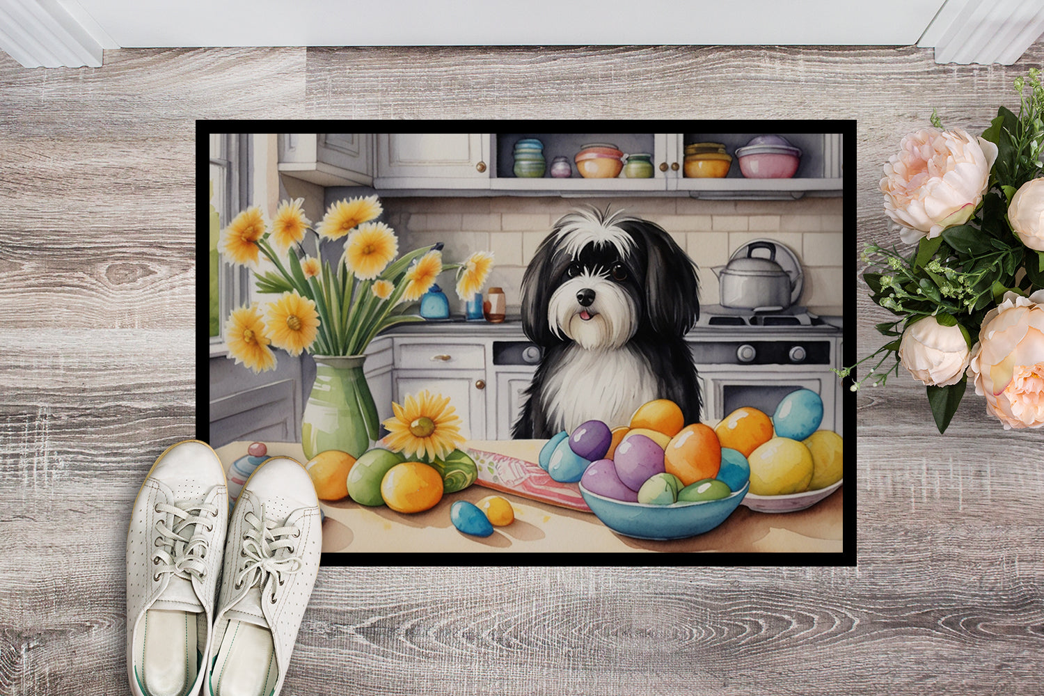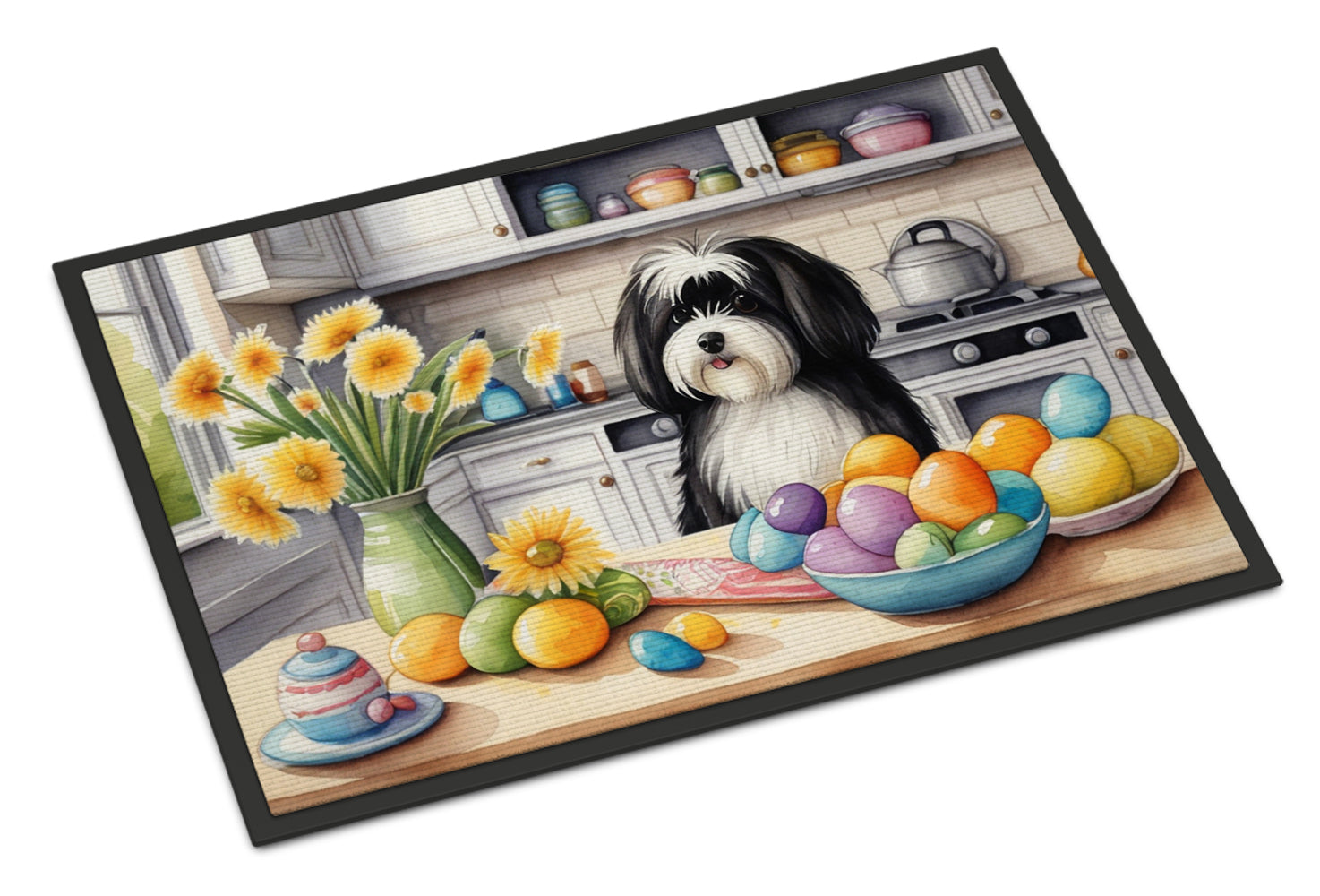 Doormat featuring breed specific Havanese artwork. Celebrate Easter with this Easter Doormat. Welcome your guests in style with our Artwork Door Mat, designed to withstand almost any weather condition. This mat, measuring approximately 24 by 36 inches, is held together by durable black binding tape. Its top layer, composed of polyester felt, is dyed with the eye-catching image you see on the mat. A few layers below provide the mat with stability, while its rubber bottom is stamped to help prevent slipping and ensures safety. Our mat works wonderfully as both an indoor or outdoor door mat. For cleaning, simply hose it off with water or use a power washer - no need for any cleaner that produces suds. Avoid scrubbing with a brush, instead, opt for the vacuum on floor setting. Designed manufactured and printed in the USA, this mat is a perfect addition to your porch, outdoor kitchen, entryway, or any indoor space. Its unique design makes it a charming decorative rug that greets your guests and adds a stylish touch to your home decor.