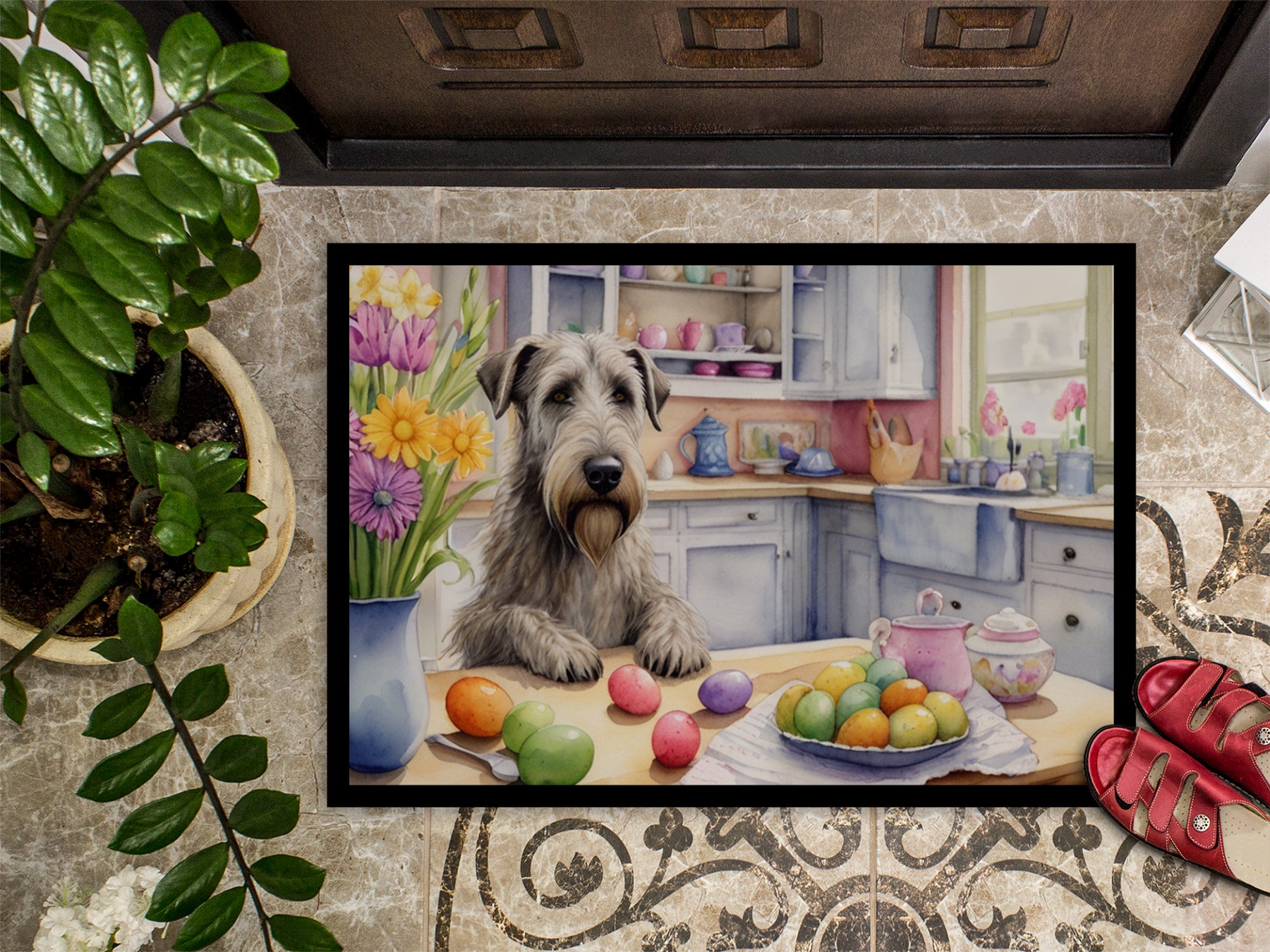 Doormat featuring breed specific Irish Wolfhound artwork. Celebrate Easter with this Easter Doormat. Welcome your guests in style with our Artwork Door Mat, designed to withstand almost any weather condition. This mat, measuring approximately 24 by 36 inches, is held together by durable black binding tape. Its top layer, composed of polyester felt, is dyed with the eye-catching image you see on the mat. A few layers below provide the mat with stability, while its rubber bottom is stamped to help prevent slipping and ensures safety. Our mat works wonderfully as both an indoor or outdoor door mat. For cleaning, simply hose it off with water or use a power washer - no need for any cleaner that produces suds. Avoid scrubbing with a brush, instead, opt for the vacuum on floor setting. Designed manufactured and printed in the USA, this mat is a perfect addition to your porch, outdoor kitchen, entryway, or any indoor space. Its unique design makes it a charming decorative rug that greets your guests and adds a stylish touch to your home decor.