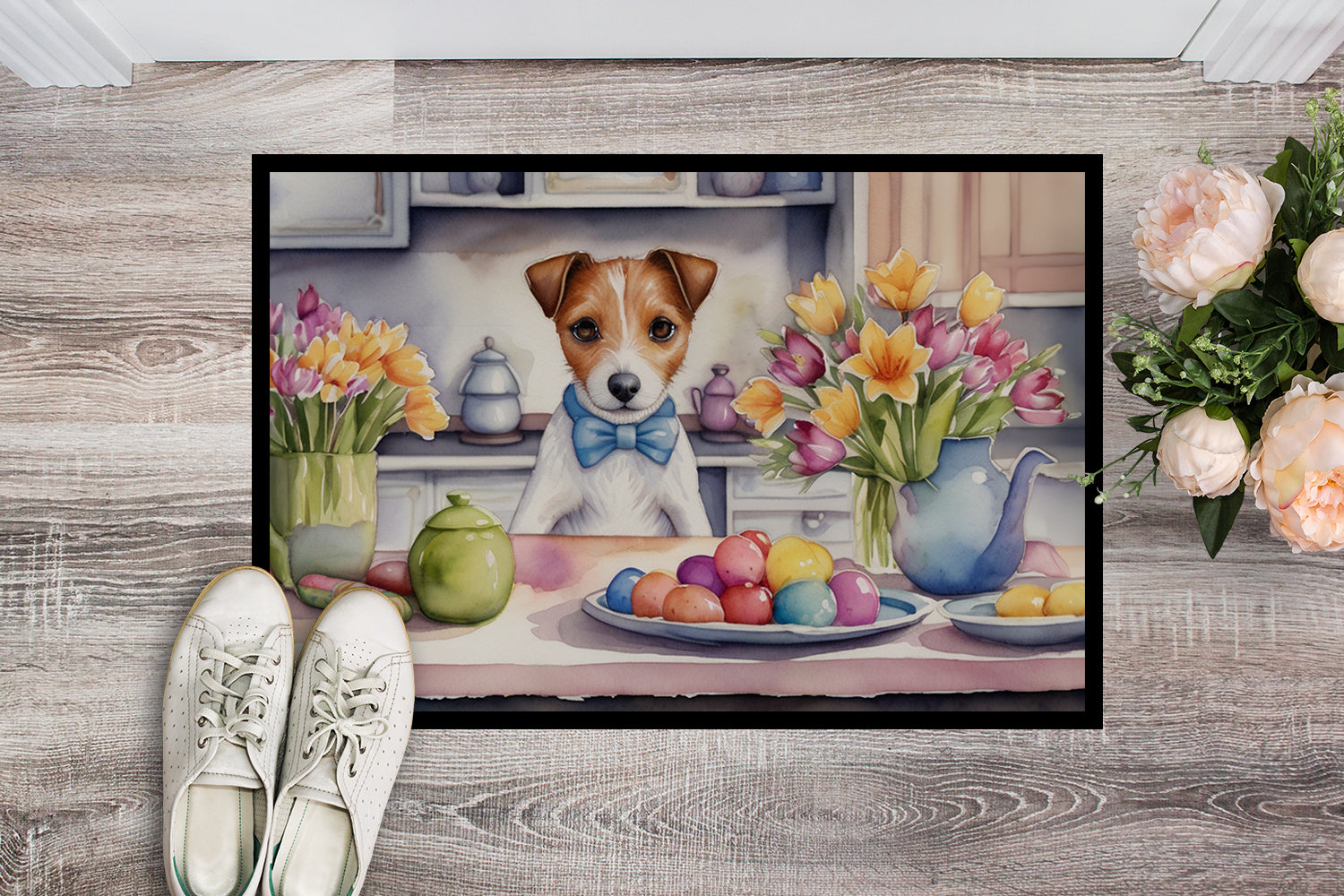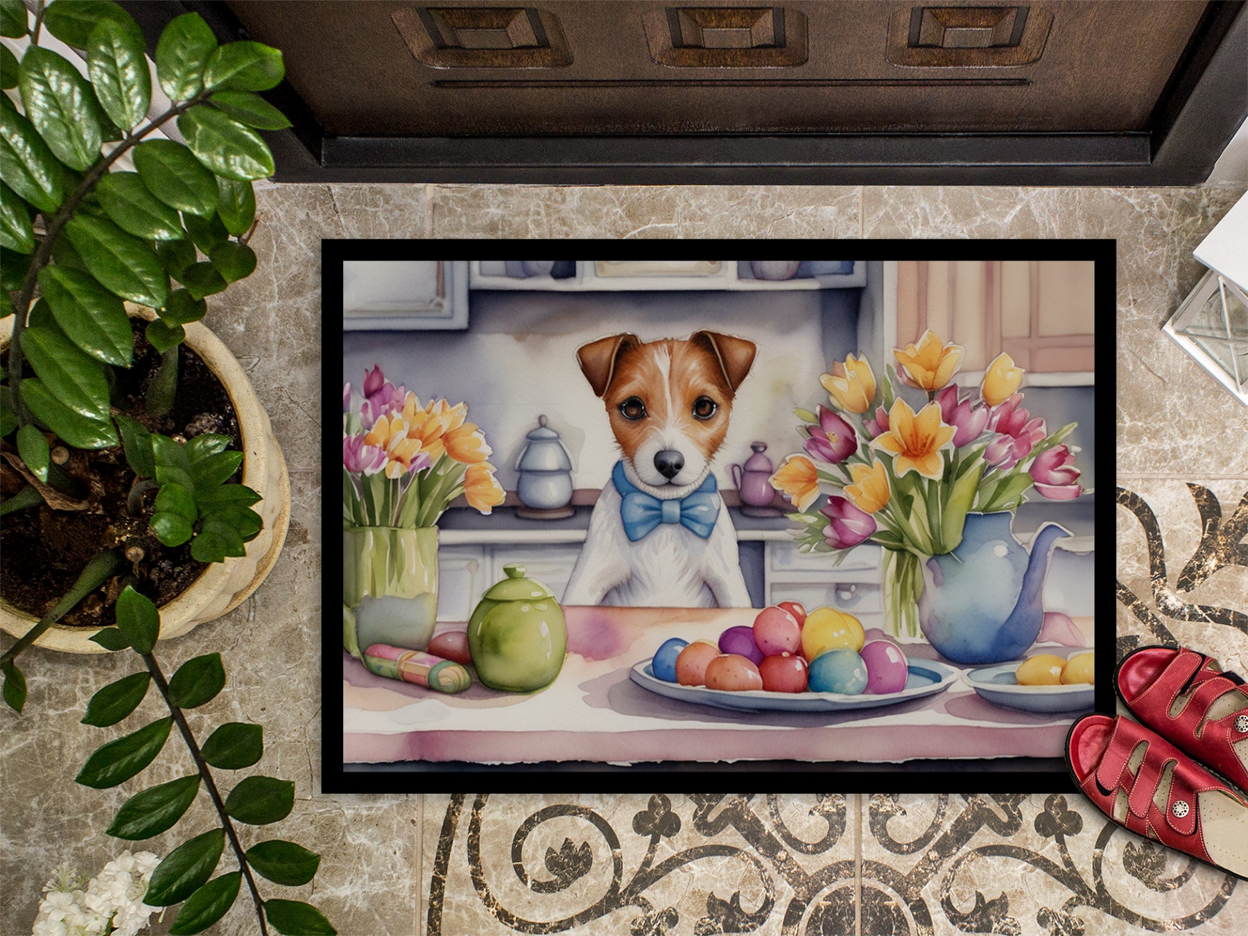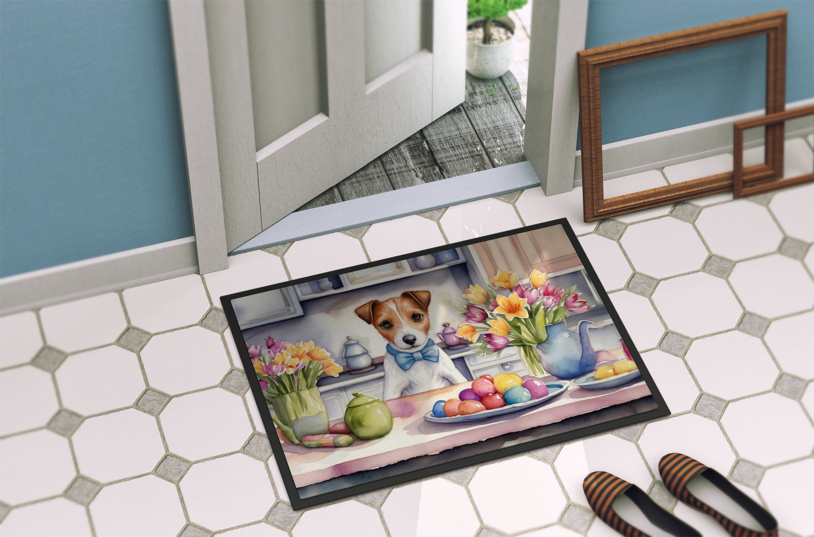 Doormat featuring breed specific Jack Russell Terrier artwork. Celebrate Easter with this Easter Doormat. Welcome your guests in style with our Artwork Door Mat, designed to withstand almost any weather condition. This mat, measuring approximately 24 by 36 inches, is held together by durable black binding tape. Its top layer, composed of polyester felt, is dyed with the eye-catching image you see on the mat. A few layers below provide the mat with stability, while its rubber bottom is stamped to help prevent slipping and ensures safety. Our mat works wonderfully as both an indoor or outdoor door mat. For cleaning, simply hose it off with water or use a power washer - no need for any cleaner that produces suds. Avoid scrubbing with a brush, instead, opt for the vacuum on floor setting. Designed manufactured and printed in the USA, this mat is a perfect addition to your porch, outdoor kitchen, entryway, or any indoor space. Its unique design makes it a charming decorative rug that greets your guests and adds a stylish touch to your home decor.