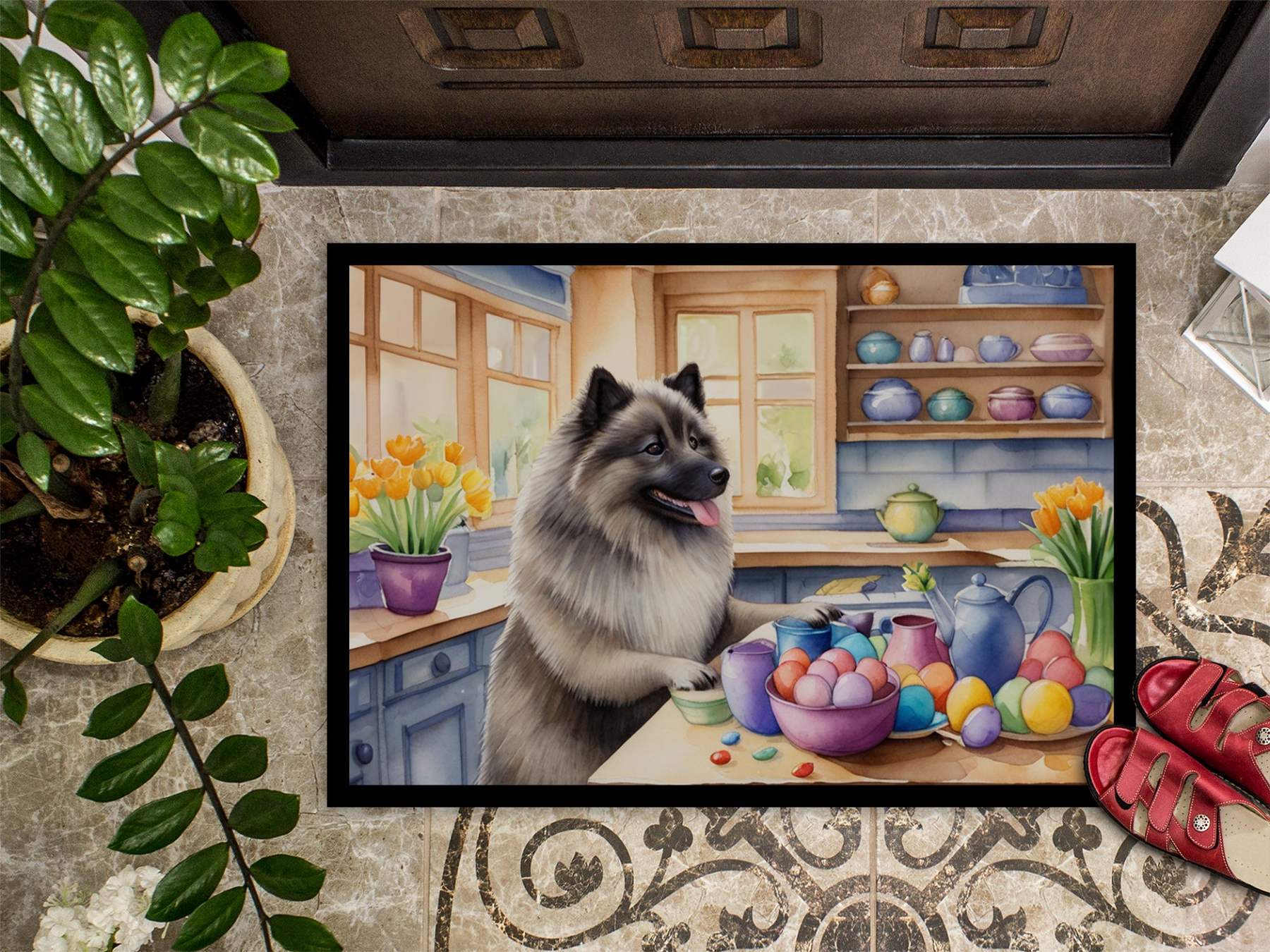 Doormat featuring breed specific Keeshond artwork. Celebrate Easter with this Easter Doormat. Welcome your guests in style with our Artwork Door Mat, designed to withstand almost any weather condition. This mat, measuring approximately 24 by 36 inches, is held together by durable black binding tape. Its top layer, composed of polyester felt, is dyed with the eye-catching image you see on the mat. A few layers below provide the mat with stability, while its rubber bottom is stamped to help prevent slipping and ensures safety. Our mat works wonderfully as both an indoor or outdoor door mat. For cleaning, simply hose it off with water or use a power washer - no need for any cleaner that produces suds. Avoid scrubbing with a brush, instead, opt for the vacuum on floor setting. Designed manufactured and printed in the USA, this mat is a perfect addition to your porch, outdoor kitchen, entryway, or any indoor space. Its unique design makes it a charming decorative rug that greets your guests and adds a stylish touch to your home decor.