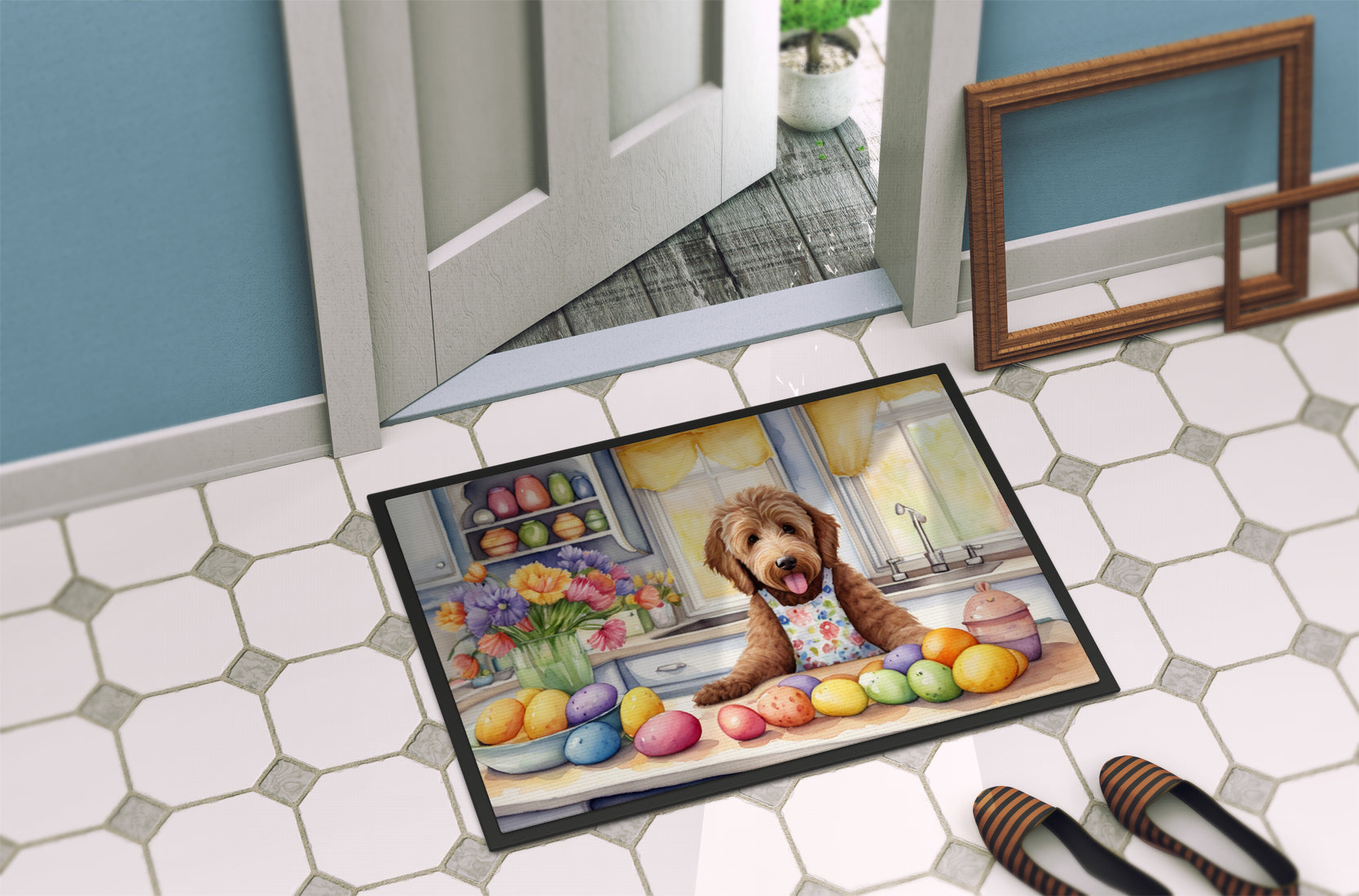 Doormat featuring breed specific Labradoodle artwork. Celebrate Easter with this Easter Doormat. Welcome your guests in style with our Artwork Door Mat, designed to withstand almost any weather condition. This mat, measuring approximately 24 by 36 inches, is held together by durable black binding tape. Its top layer, composed of polyester felt, is dyed with the eye-catching image you see on the mat. A few layers below provide the mat with stability, while its rubber bottom is stamped to help prevent slipping and ensures safety. Our mat works wonderfully as both an indoor or outdoor door mat. For cleaning, simply hose it off with water or use a power washer - no need for any cleaner that produces suds. Avoid scrubbing with a brush, instead, opt for the vacuum on floor setting. Designed manufactured and printed in the USA, this mat is a perfect addition to your porch, outdoor kitchen, entryway, or any indoor space. Its unique design makes it a charming decorative rug that greets your guests and adds a stylish touch to your home decor.