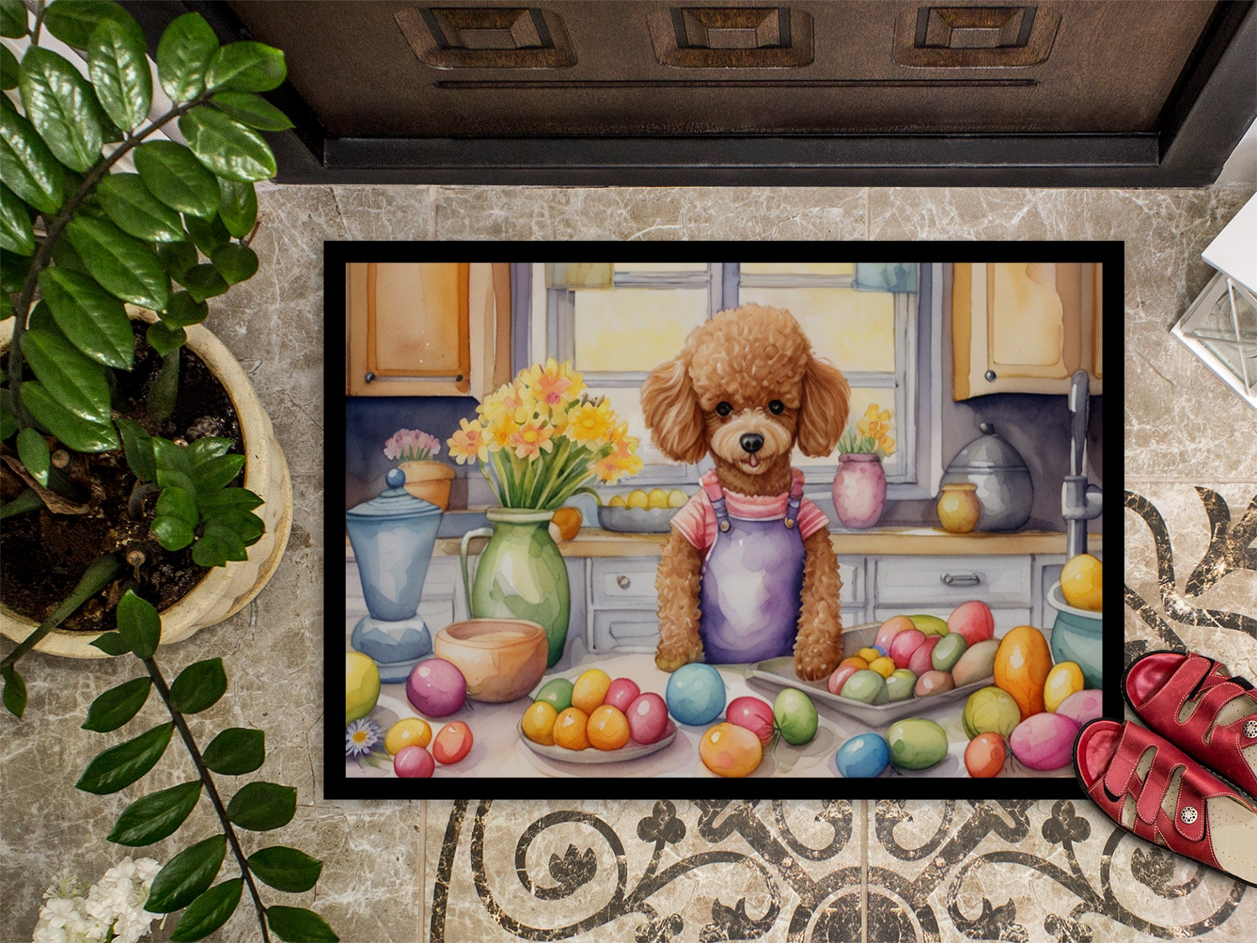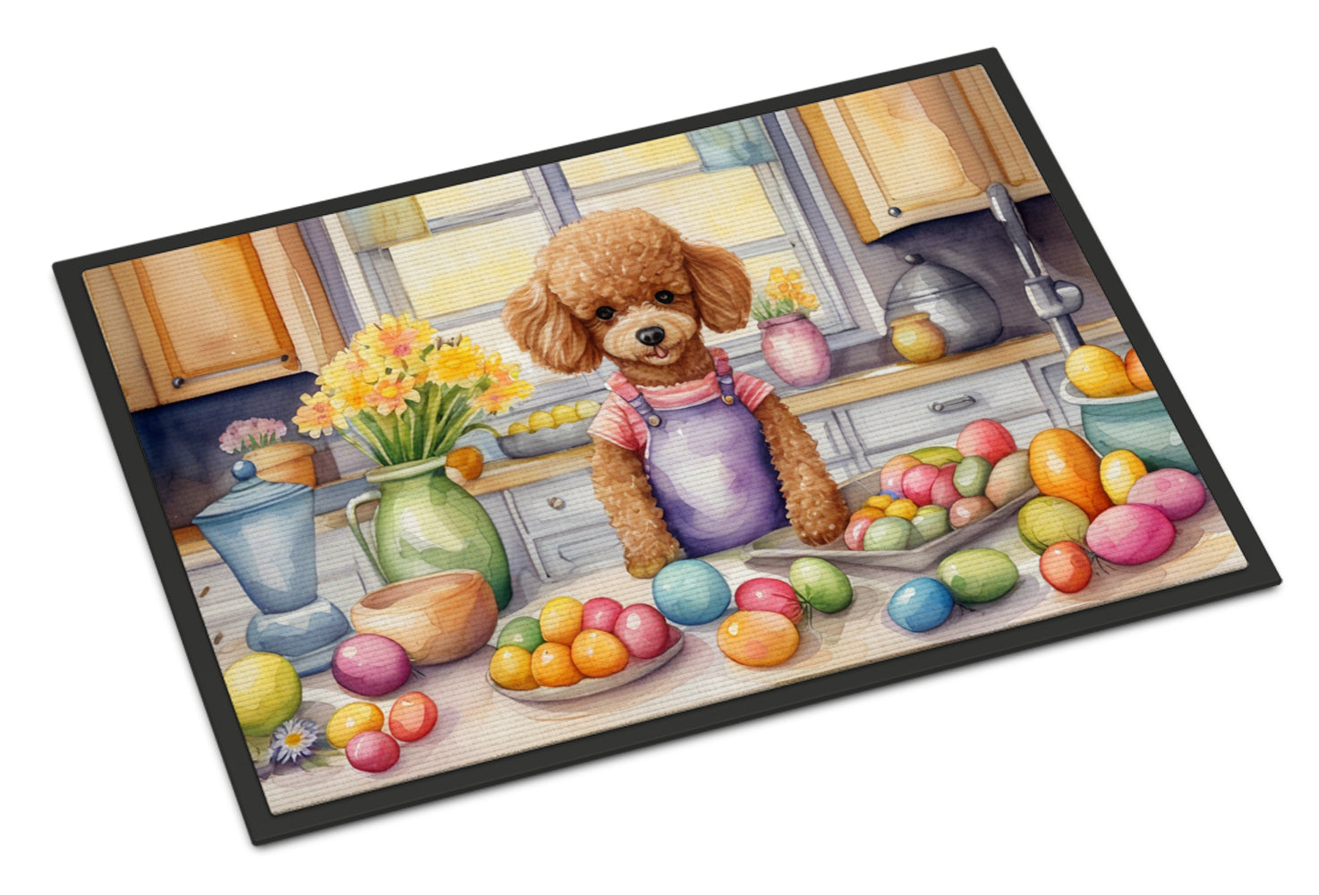Doormat featuring breed specific Poodle artwork. Celebrate Easter with this Easter Doormat. Welcome your guests in style with our Artwork Door Mat, designed to withstand almost any weather condition. This mat, measuring approximately 24 by 36 inches, is held together by durable black binding tape. Its top layer, composed of polyester felt, is dyed with the eye-catching image you see on the mat. A few layers below provide the mat with stability, while its rubber bottom is stamped to help prevent slipping and ensures safety. Our mat works wonderfully as both an indoor or outdoor door mat. For cleaning, simply hose it off with water or use a power washer - no need for any cleaner that produces suds. Avoid scrubbing with a brush, instead, opt for the vacuum on floor setting. Designed manufactured and printed in the USA, this mat is a perfect addition to your porch, outdoor kitchen, entryway, or any indoor space. Its unique design makes it a charming decorative rug that greets your guests and adds a stylish touch to your home decor.