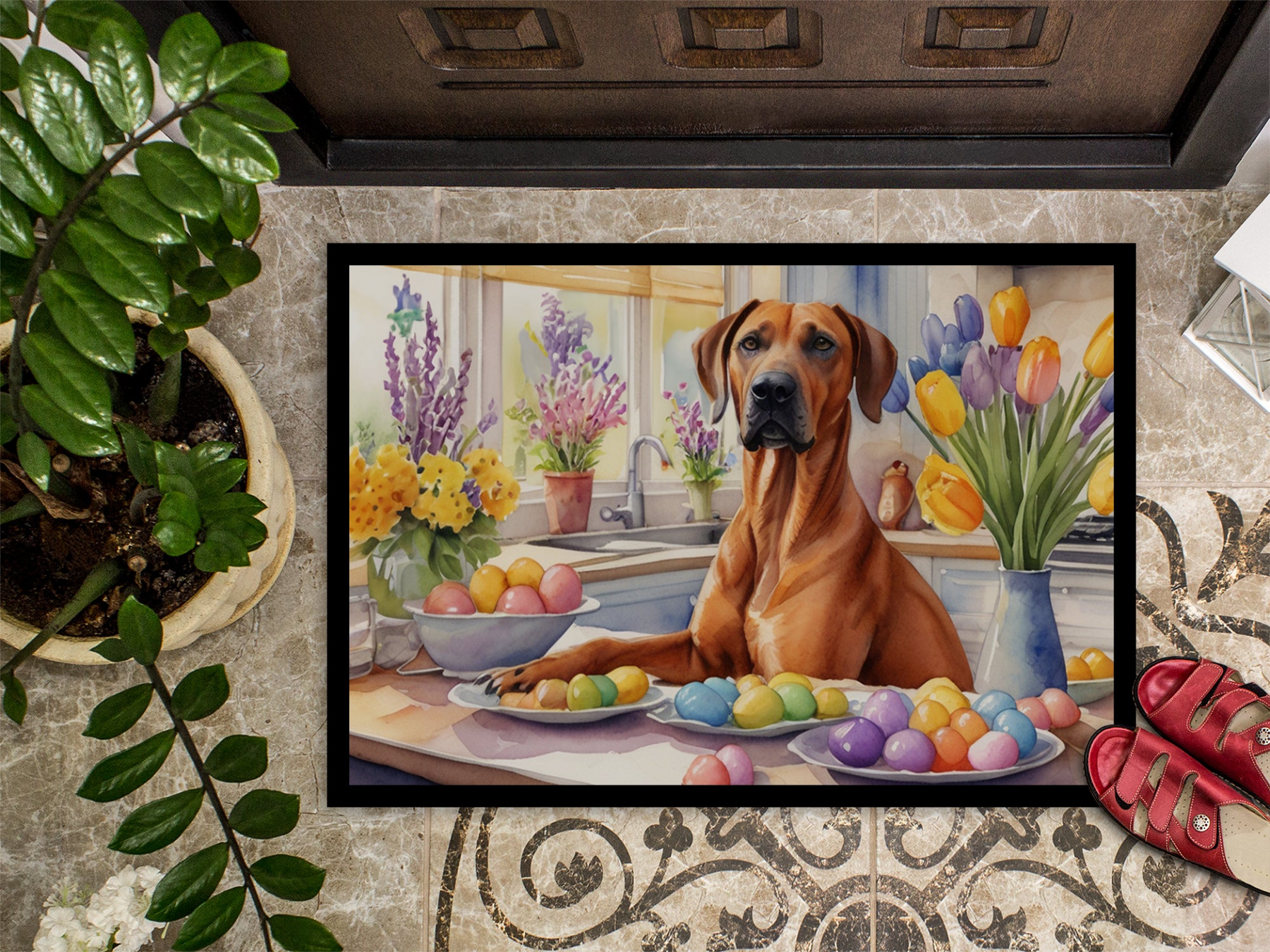 Doormat featuring breed specific Rhodesian Ridgeback artwork. Celebrate Easter with this Easter Doormat. Welcome your guests in style with our Artwork Door Mat, designed to withstand almost any weather condition. This mat, measuring approximately 24 by 36 inches, is held together by durable black binding tape. Its top layer, composed of polyester felt, is dyed with the eye-catching image you see on the mat. A few layers below provide the mat with stability, while its rubber bottom is stamped to help prevent slipping and ensures safety. Our mat works wonderfully as both an indoor or outdoor door mat. For cleaning, simply hose it off with water or use a power washer - no need for any cleaner that produces suds. Avoid scrubbing with a brush, instead, opt for the vacuum on floor setting. Designed manufactured and printed in the USA, this mat is a perfect addition to your porch, outdoor kitchen, entryway, or any indoor space. Its unique design makes it a charming decorative rug that greets your guests and adds a stylish touch to your home decor.