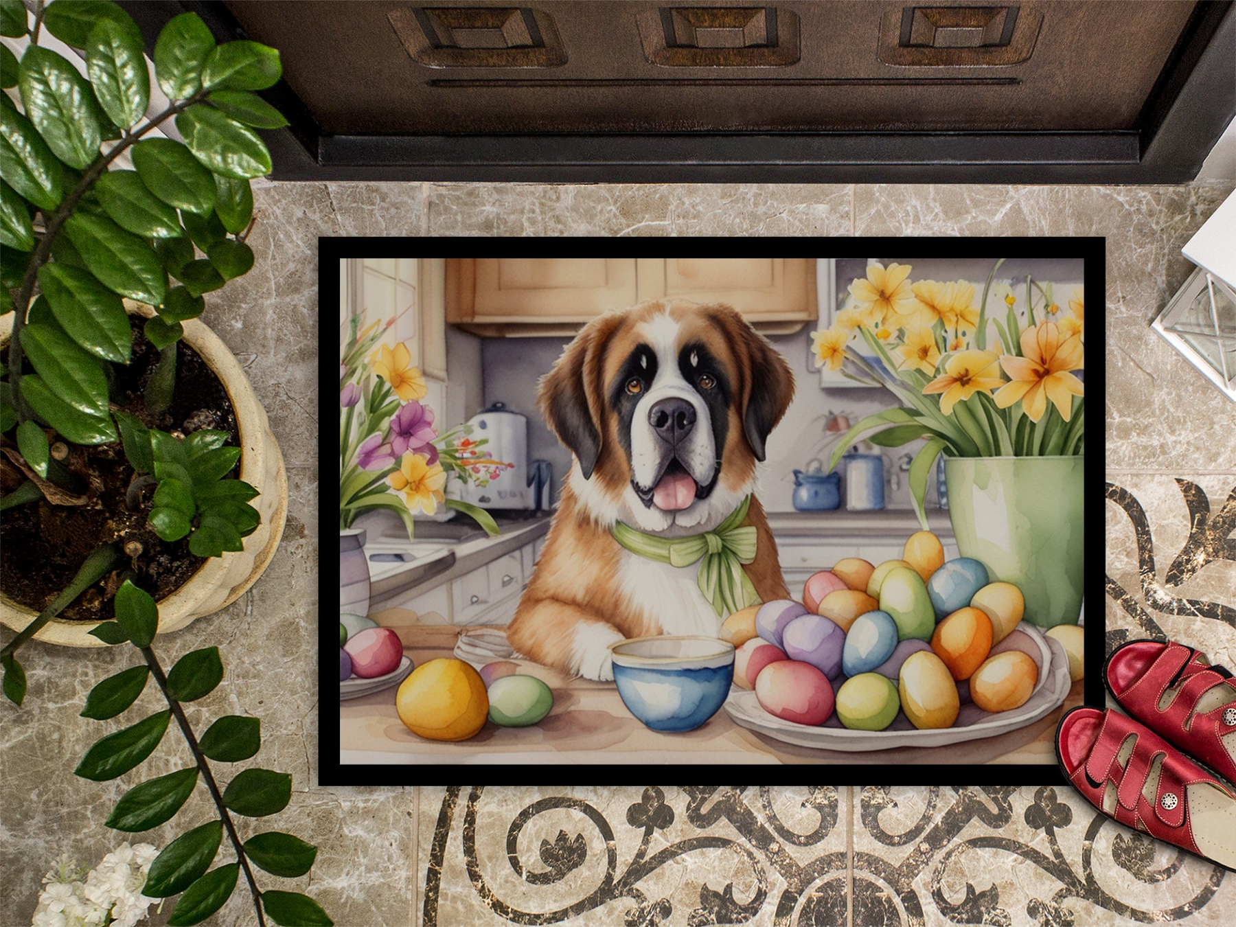 Doormat featuring breed specific Saint Bernard artwork. Celebrate Easter with this Easter Doormat. Welcome your guests in style with our Artwork Door Mat, designed to withstand almost any weather condition. This mat, measuring approximately 24 by 36 inches, is held together by durable black binding tape. Its top layer, composed of polyester felt, is dyed with the eye-catching image you see on the mat. A few layers below provide the mat with stability, while its rubber bottom is stamped to help prevent slipping and ensures safety. Our mat works wonderfully as both an indoor or outdoor door mat. For cleaning, simply hose it off with water or use a power washer - no need for any cleaner that produces suds. Avoid scrubbing with a brush, instead, opt for the vacuum on floor setting. Designed manufactured and printed in the USA, this mat is a perfect addition to your porch, outdoor kitchen, entryway, or any indoor space. Its unique design makes it a charming decorative rug that greets your guests and adds a stylish touch to your home decor.