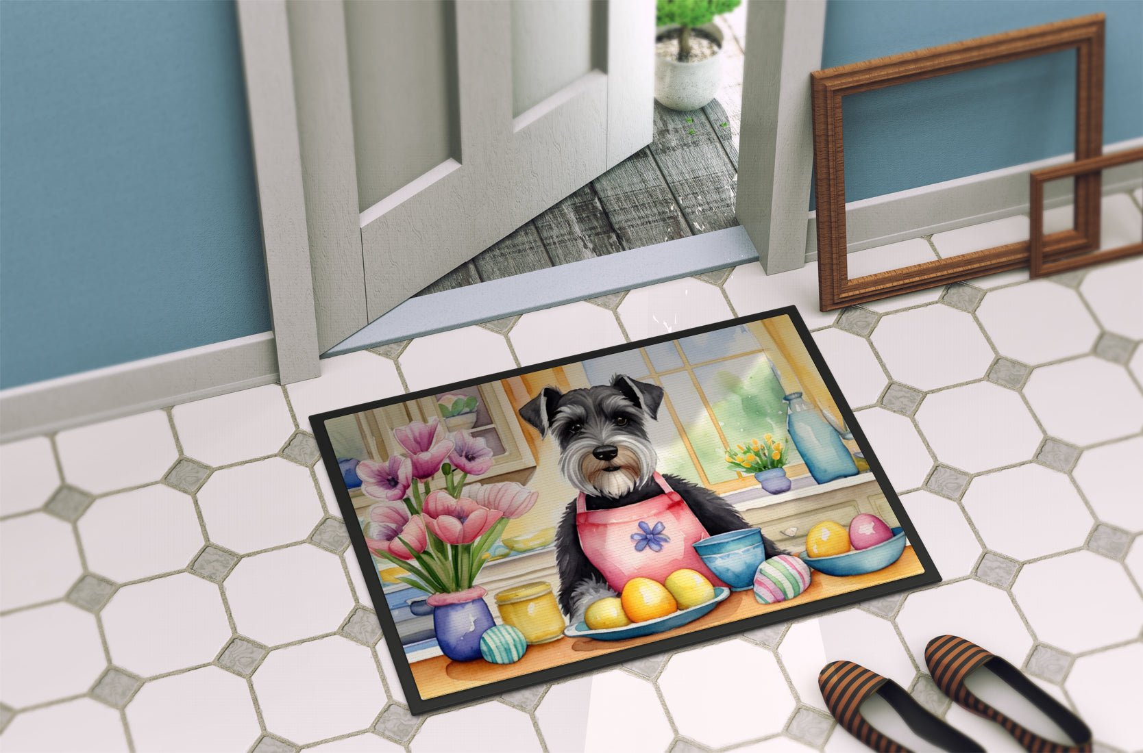 Doormat featuring breed specific Schnauzer artwork. Celebrate Easter with this Easter Doormat. Welcome your guests in style with our Artwork Door Mat, designed to withstand almost any weather condition. This mat, measuring approximately 24 by 36 inches, is held together by durable black binding tape. Its top layer, composed of polyester felt, is dyed with the eye-catching image you see on the mat. A few layers below provide the mat with stability, while its rubber bottom is stamped to help prevent slipping and ensures safety. Our mat works wonderfully as both an indoor or outdoor door mat. For cleaning, simply hose it off with water or use a power washer - no need for any cleaner that produces suds. Avoid scrubbing with a brush, instead, opt for the vacuum on floor setting. Designed manufactured and printed in the USA, this mat is a perfect addition to your porch, outdoor kitchen, entryway, or any indoor space. Its unique design makes it a charming decorative rug that greets your guests and adds a stylish touch to your home decor.