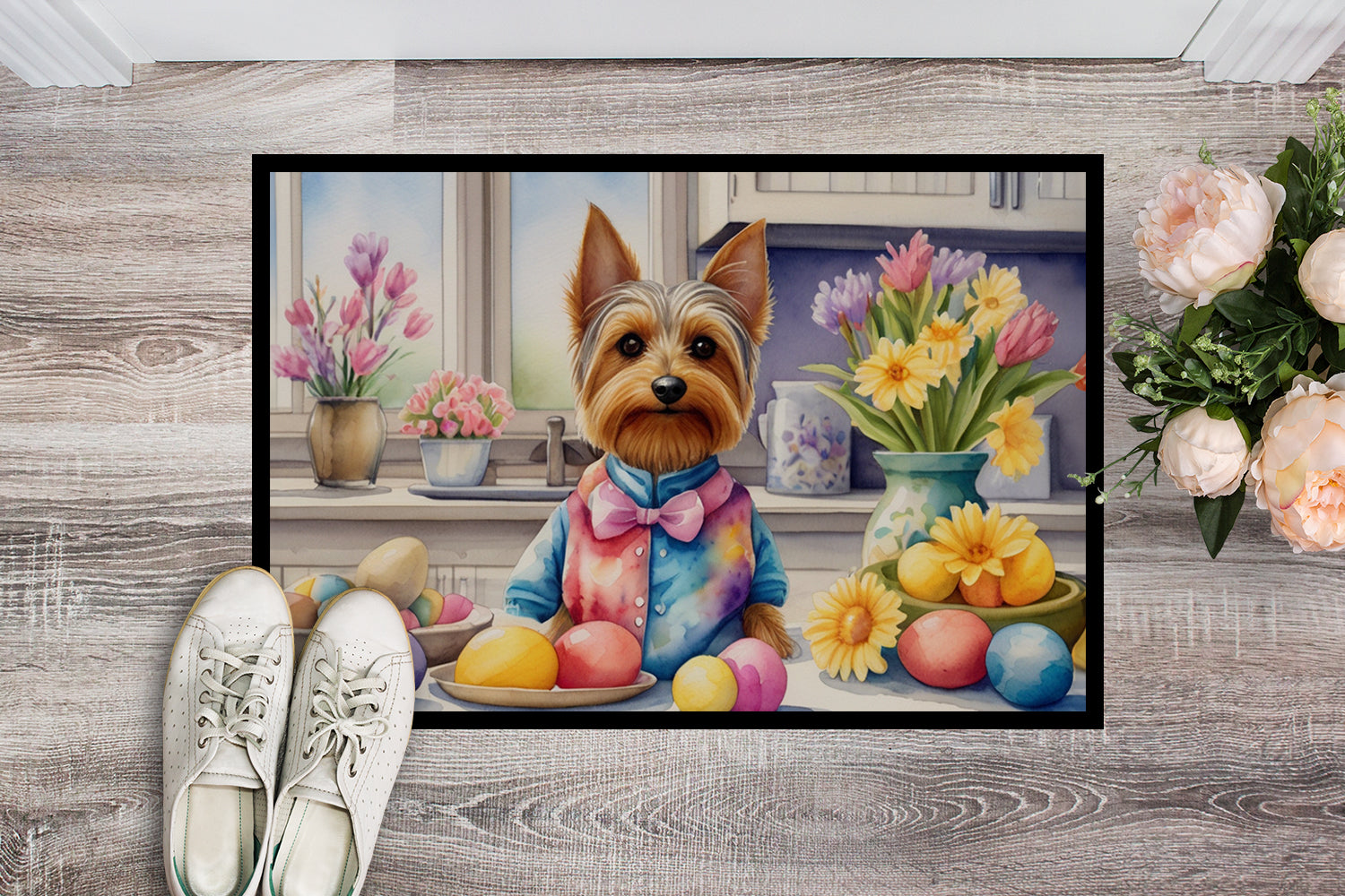 Doormat featuring breed specific Silky Terrier artwork. Celebrate Easter with this Easter Doormat. Welcome your guests in style with our Artwork Door Mat, designed to withstand almost any weather condition. This mat, measuring approximately 24 by 36 inches, is held together by durable black binding tape. Its top layer, composed of polyester felt, is dyed with the eye-catching image you see on the mat. A few layers below provide the mat with stability, while its rubber bottom is stamped to help prevent slipping and ensures safety. Our mat works wonderfully as both an indoor or outdoor door mat. For cleaning, simply hose it off with water or use a power washer - no need for any cleaner that produces suds. Avoid scrubbing with a brush, instead, opt for the vacuum on floor setting. Designed manufactured and printed in the USA, this mat is a perfect addition to your porch, outdoor kitchen, entryway, or any indoor space. Its unique design makes it a charming decorative rug that greets your guests and adds a stylish touch to your home decor.