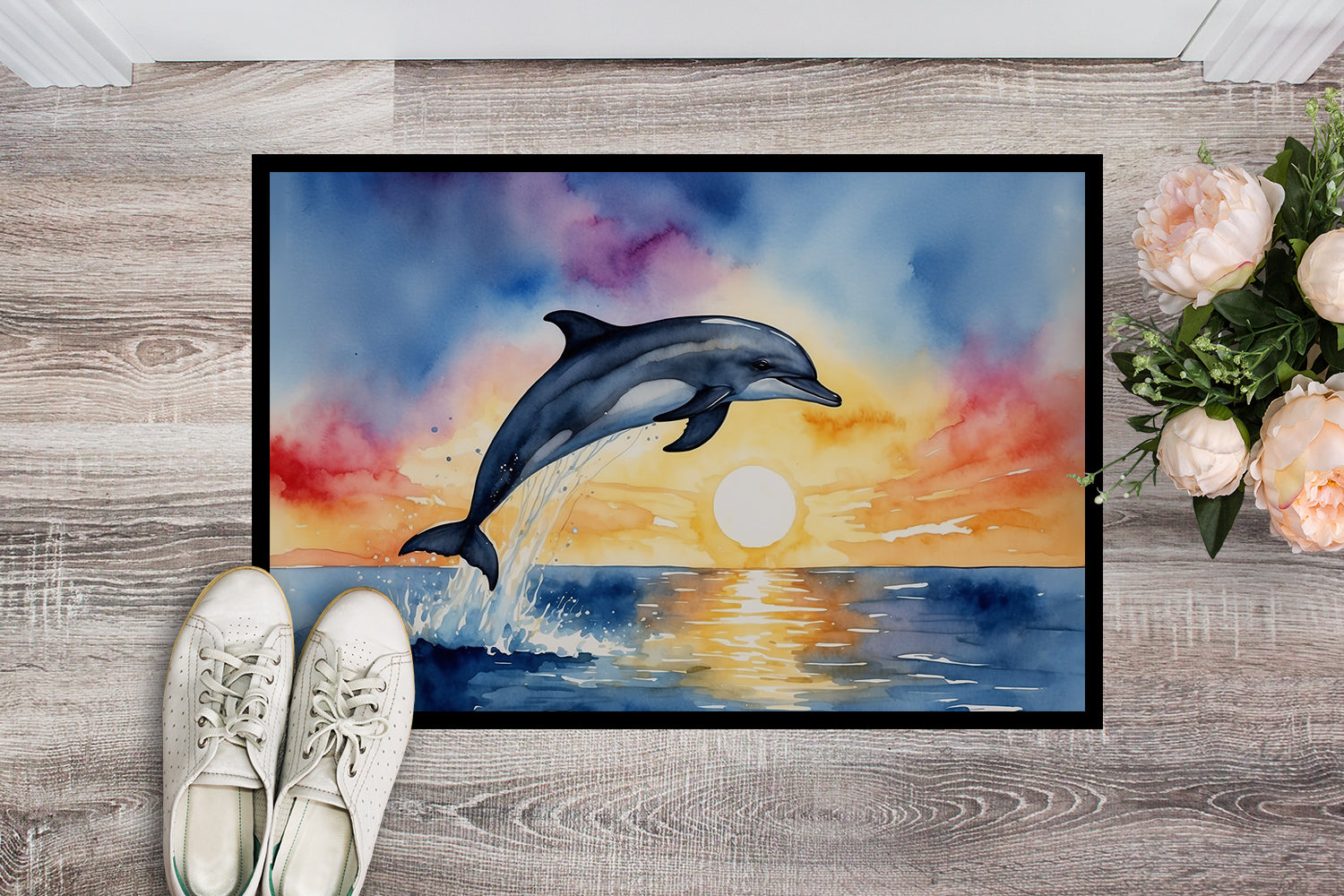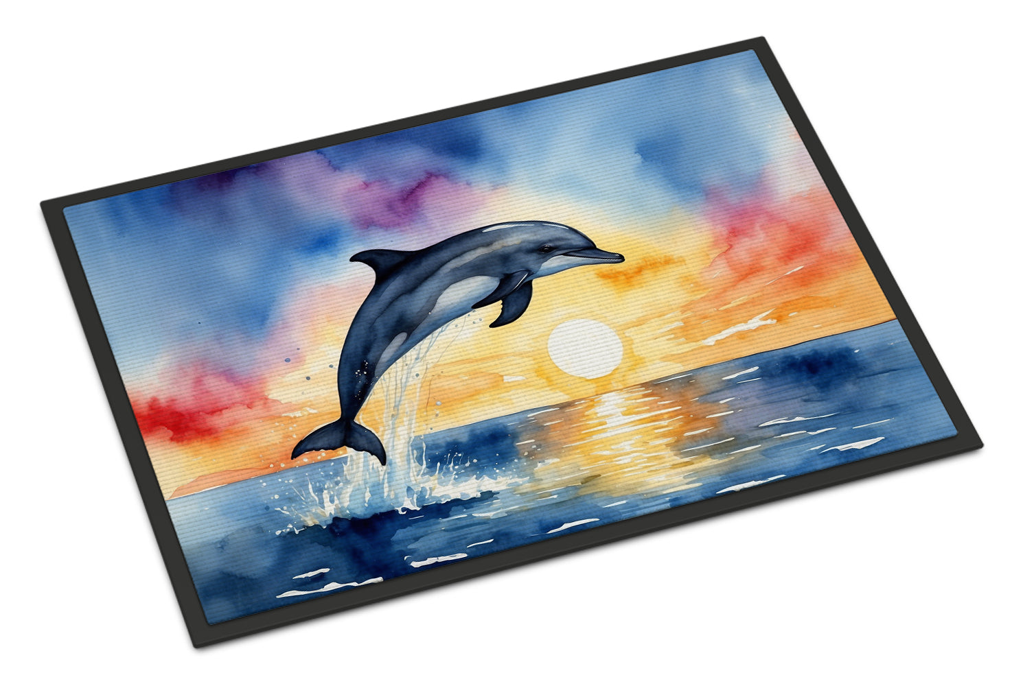 Doormat featuring breed specific Dolphin artwork. Welcome your guests in style with our Artwork Door Mat, designed to withstand almost any weather condition. This mat, measuring approximately 24 by 36 inches, is held together by durable black binding tape. Its top layer, composed of polyester felt, is dyed with the eye-catching image you see on the mat. A few layers below provide the mat with stability, while its rubber bottom is stamped to help prevent slipping and ensures safety. Our mat works wonderfully as both an indoor or outdoor door mat. For cleaning, simply hose it off with water or use a power washer - no need for any cleaner that produces suds. Avoid scrubbing with a brush, instead, opt for the vacuum on floor setting. Designed manufactured and printed in the USA, this mat is a perfect addition to your porch, outdoor kitchen, entryway, or any indoor space. Its unique design makes it a charming decorative rug that greets your guests and adds a stylish touch to your home decor.