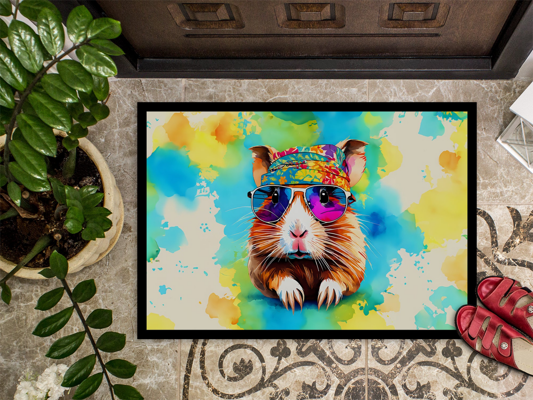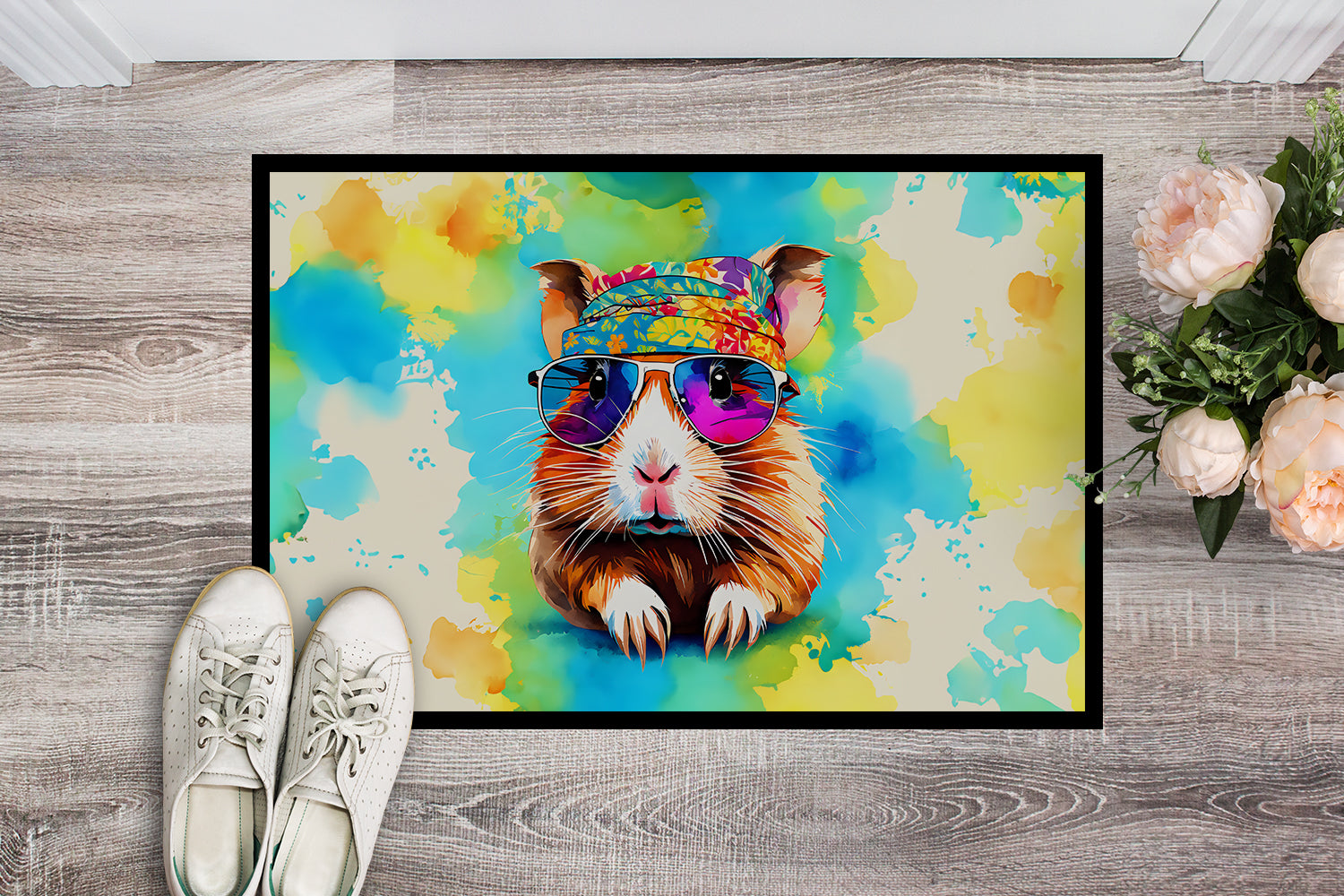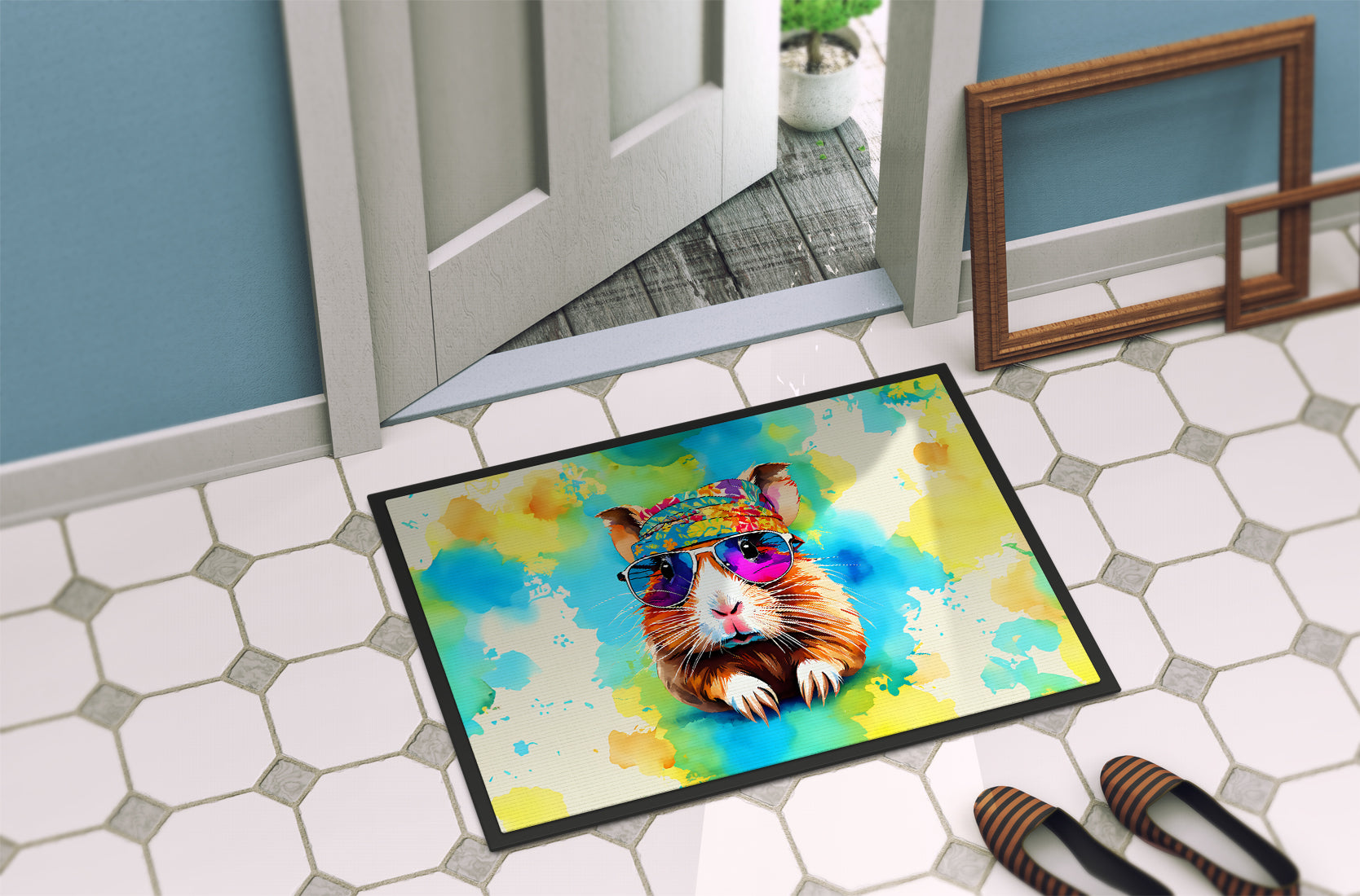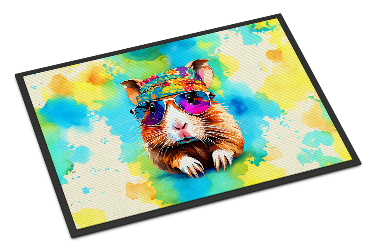 Doormat featuring breed specific Guinea Pig artwork. Welcome your guests in style with our Artwork Door Mat, designed to withstand almost any weather condition. This mat, measuring approximately 24 by 36 inches, is held together by durable black binding tape. Its top layer, composed of polyester felt, is dyed with the eye-catching image you see on the mat. A few layers below provide the mat with stability, while its rubber bottom is stamped to help prevent slipping and ensures safety. Our mat works wonderfully as both an indoor or outdoor door mat. For cleaning, simply hose it off with water or use a power washer - no need for any cleaner that produces suds. Avoid scrubbing with a brush, instead, opt for the vacuum on floor setting. Designed manufactured and printed in the USA, this mat is a perfect addition to your porch, outdoor kitchen, entryway, or any indoor space. Its unique design makes it a charming decorative rug that greets your guests and adds a stylish touch to your home decor.
