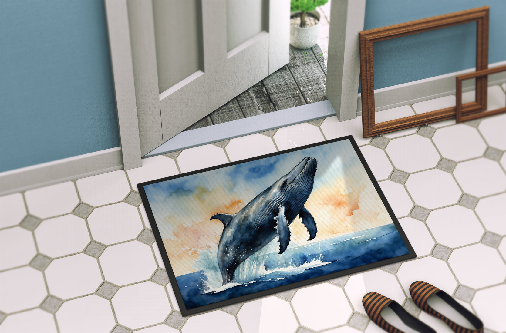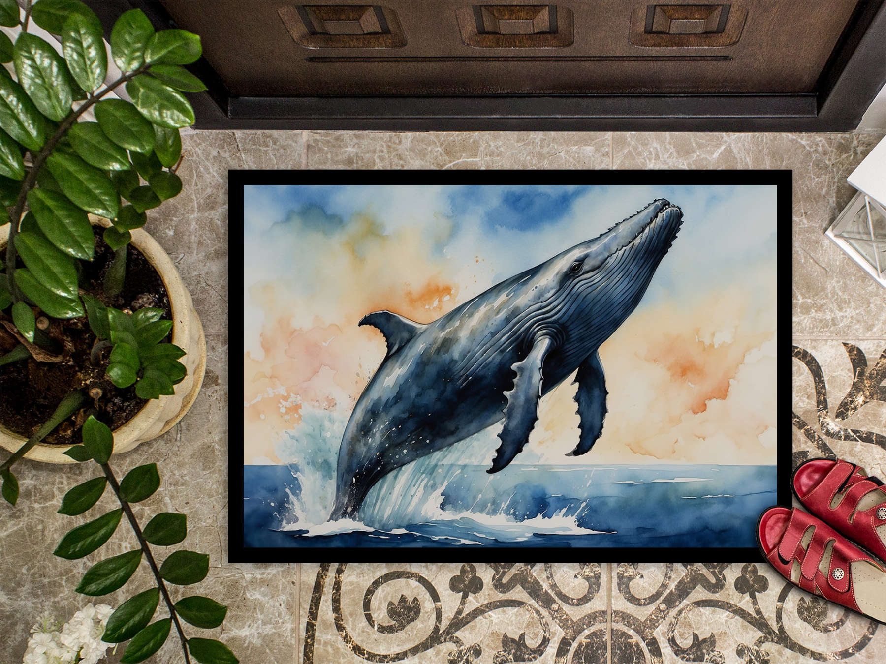 Doormat featuring breed specific Humpback Whale artwork. Welcome your guests in style with our Artwork Door Mat, designed to withstand almost any weather condition. This mat, measuring approximately 24 by 36 inches, is held together by durable black binding tape. Its top layer, composed of polyester felt, is dyed with the eye-catching image you see on the mat. A few layers below provide the mat with stability, while its rubber bottom is stamped to help prevent slipping and ensures safety. Our mat works wonderfully as both an indoor or outdoor door mat. For cleaning, simply hose it off with water or use a power washer - no need for any cleaner that produces suds. Avoid scrubbing with a brush, instead, opt for the vacuum on floor setting. Designed manufactured and printed in the USA, this mat is a perfect addition to your porch, outdoor kitchen, entryway, or any indoor space. Its unique design makes it a charming decorative rug that greets your guests and adds a stylish touch to your home decor.