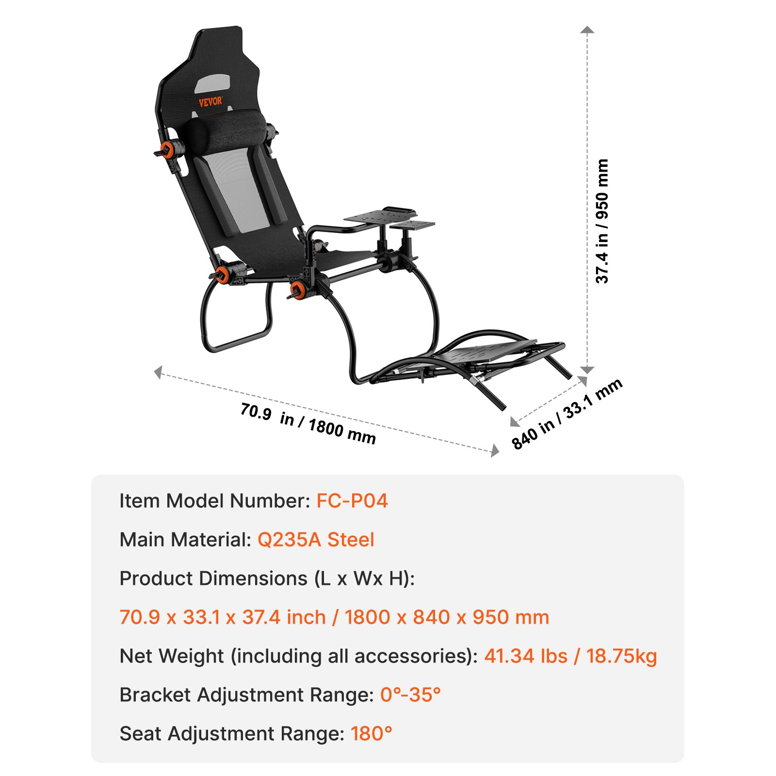 Matchable Steering Wheel Assembly: Logitech G923/G920/G29, Thrustmaster T248P, Fanatec, Hori, Mad Catz, and more!,Net Weight (including all accessories): 41.34 lbs / 18.75kg,Seat Adjustment Range: 180°,Item Model Number: FC-P04,Product Dimensions (L x Wx H): 70.9 x 33.1 x 37.4 inch / 1800 x 840 x 950 mm,Pedal Adjustment Range: 0°- 40°,Main Material: Q235A Steel,Bracket Adjustment Range:0°-35°