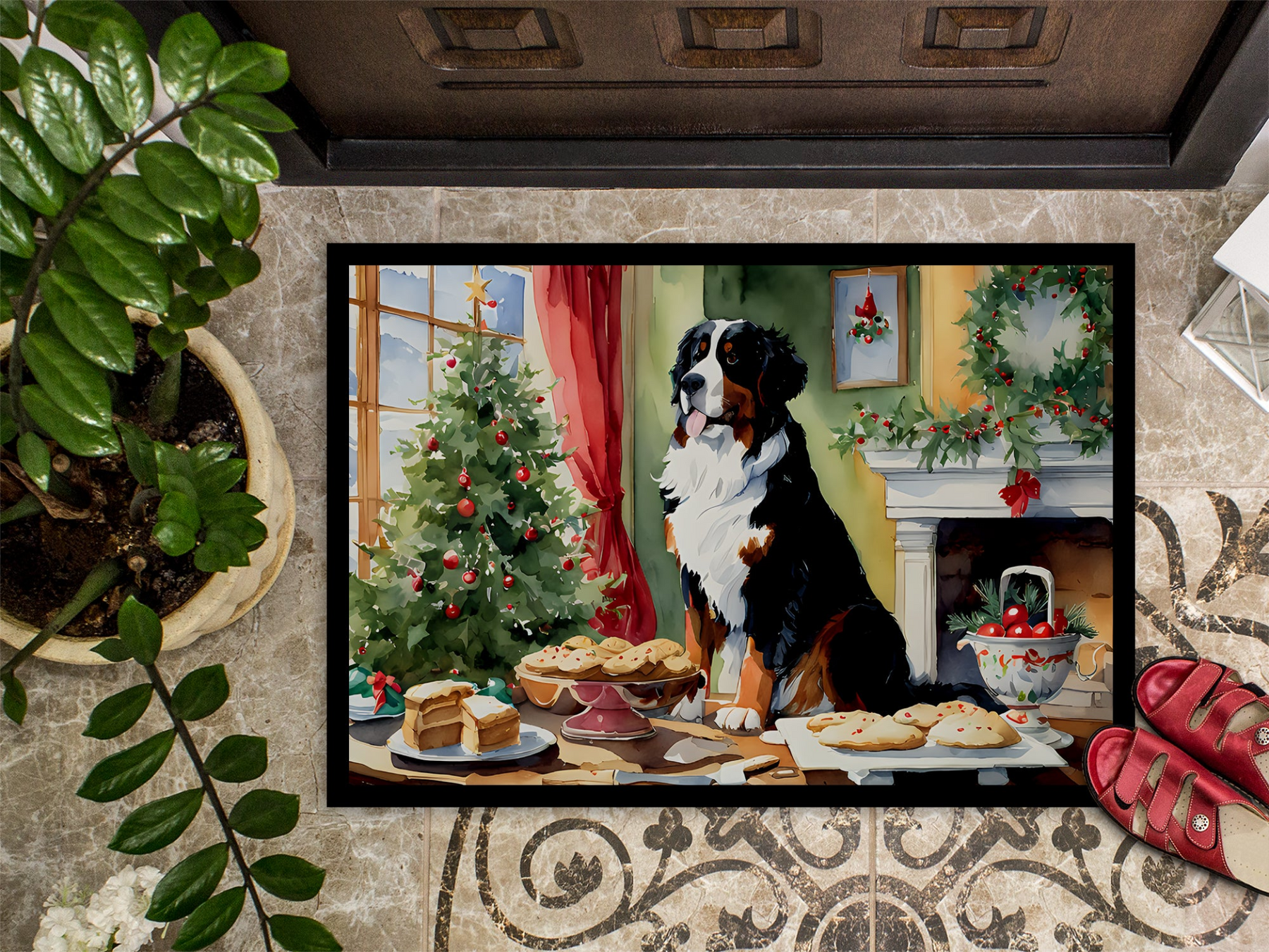 Doormat featuring breed specific Bernese Mountain Dog artwork. Celebrate Christmas with this Christmas Doormat. Welcome your guests in style with our Artwork Door Mat, designed to withstand almost any weather condition. This mat, measuring approximately 24 by 36 inches, is held together by durable black binding tape. Its top layer, composed of polyester felt, is dyed with the eye-catching image you see on the mat. A few layers below provide the mat with stability, while its rubber bottom is stamped to help prevent slipping and ensures safety. Our mat works wonderfully as both an indoor or outdoor door mat. For cleaning, simply hose it off with water or use a power washer - no need for any cleaner that produces suds. Avoid scrubbing with a brush, instead, opt for the vacuum on floor setting. Designed manufactured and printed in the USA, this mat is a perfect addition to your porch, outdoor kitchen, entryway, or any indoor space. Its unique design makes it a charming decorative rug that greets your guests and adds a stylish touch to your home decor.