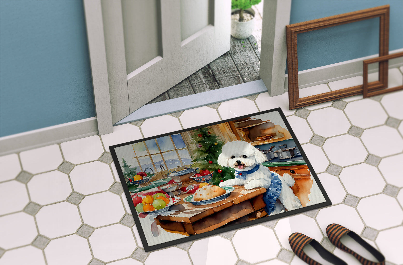 Doormat featuring breed specific Bichon Frise artwork. Celebrate Christmas with this Christmas Doormat. Welcome your guests in style with our Artwork Door Mat, designed to withstand almost any weather condition. This mat, measuring approximately 24 by 36 inches, is held together by durable black binding tape. Its top layer, composed of polyester felt, is dyed with the eye-catching image you see on the mat. A few layers below provide the mat with stability, while its rubber bottom is stamped to help prevent slipping and ensures safety. Our mat works wonderfully as both an indoor or outdoor door mat. For cleaning, simply hose it off with water or use a power washer - no need for any cleaner that produces suds. Avoid scrubbing with a brush, instead, opt for the vacuum on floor setting. Designed manufactured and printed in the USA, this mat is a perfect addition to your porch, outdoor kitchen, entryway, or any indoor space. Its unique design makes it a charming decorative rug that greets your guests and adds a stylish touch to your home decor.