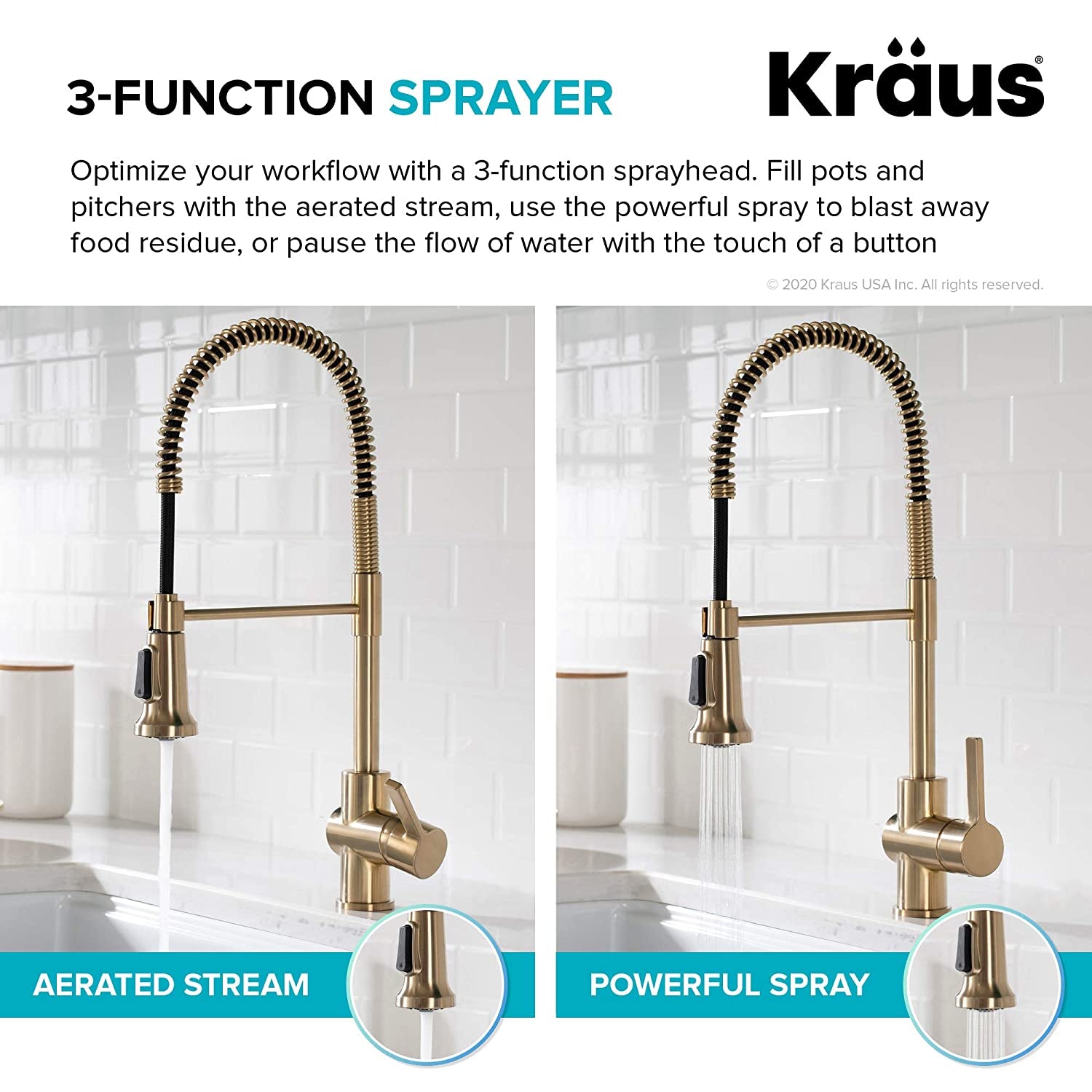 - 3-FUNCTION KITCHEN FAUCET WITH SPRAYER has large non-slip rubber button that switches between aerated stream to powerful spray to pausing the flow of water when needed – DOCKING ARM WITH HOLDER keeps flexible spring sprayer securely in place