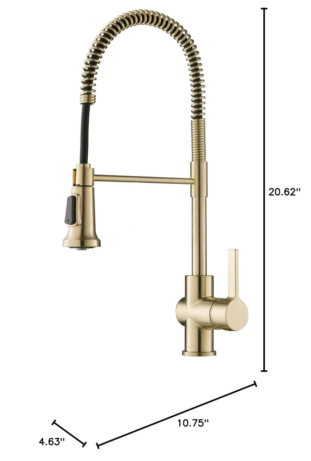 - COMMERCIAL FAUCET DESIGN with a heavy-duty open coil spring spout creates an industrial look with modern appeal – DIMENSIONS: Kitchen Faucet Height: 20 5/8 in. - Spout Height: 6 3/8 in. - Spout Reach 8 1/2 in. - Flow Rate 1.8 gpm