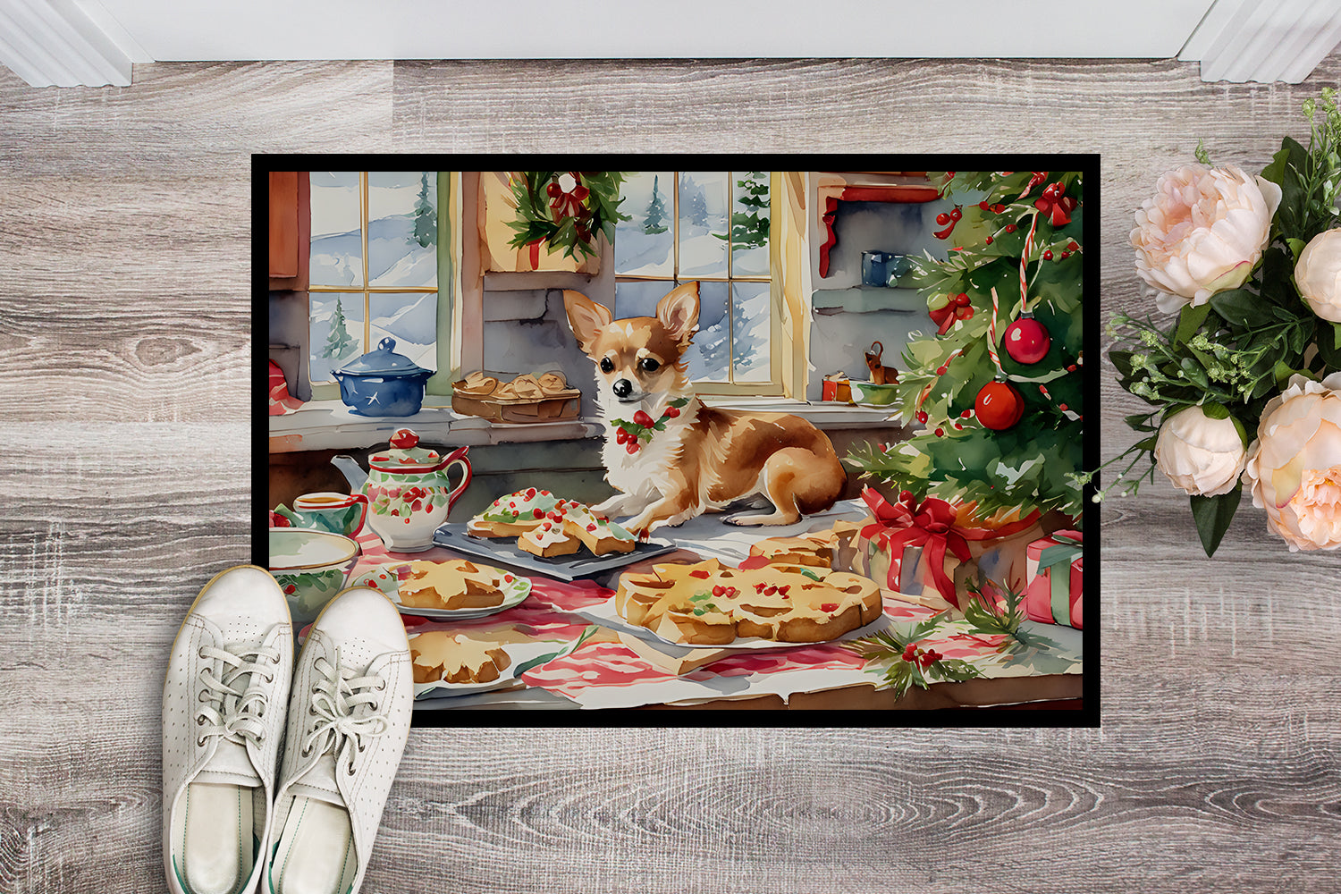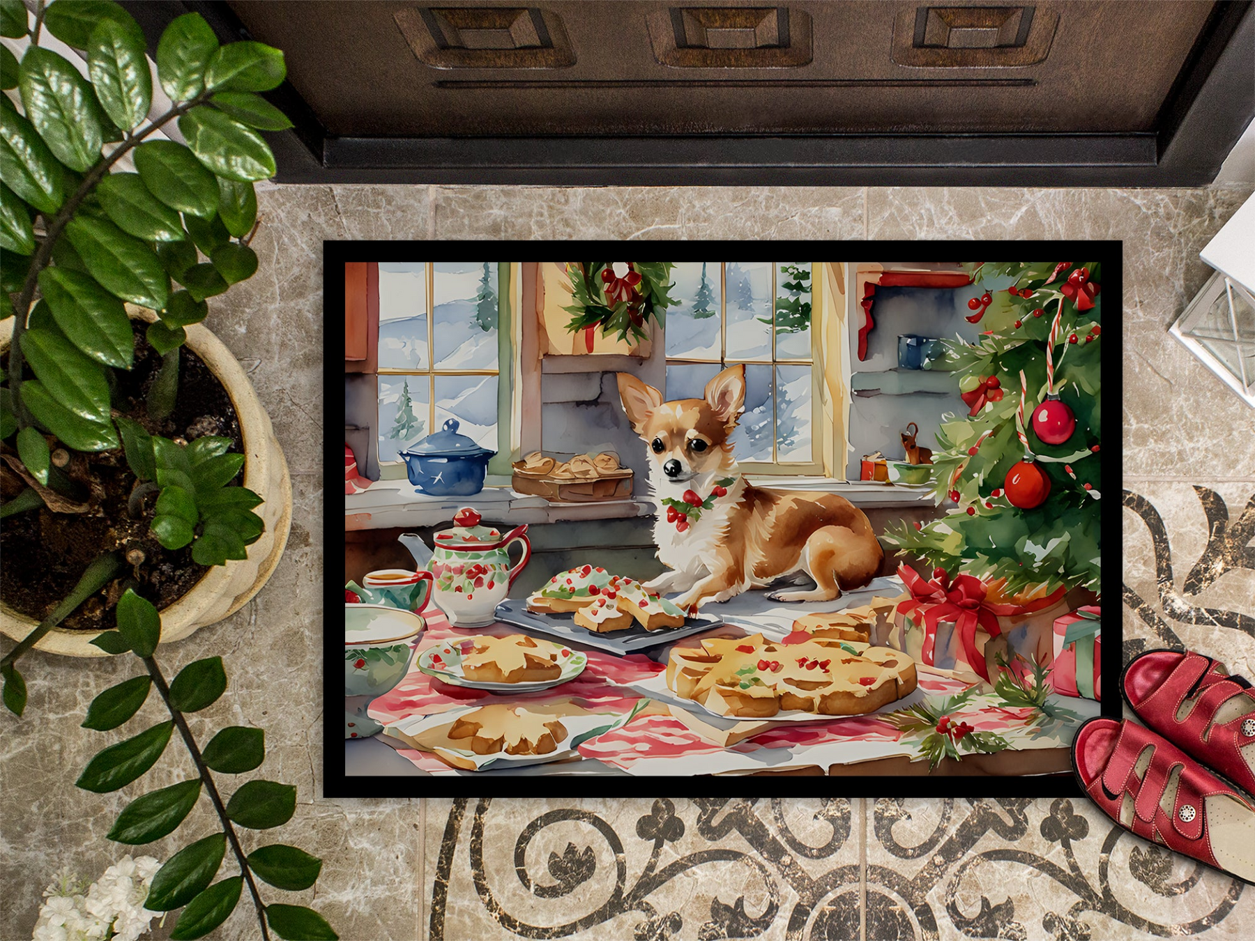 Doormat featuring breed specific Chihuahua artwork. Celebrate Christmas with this Christmas Doormat. Welcome your guests in style with our Artwork Door Mat, designed to withstand almost any weather condition. This mat, measuring approximately 24 by 36 inches, is held together by durable black binding tape. Its top layer, composed of polyester felt, is dyed with the eye-catching image you see on the mat. A few layers below provide the mat with stability, while its rubber bottom is stamped to help prevent slipping and ensures safety. Our mat works wonderfully as both an indoor or outdoor door mat. For cleaning, simply hose it off with water or use a power washer - no need for any cleaner that produces suds. Avoid scrubbing with a brush, instead, opt for the vacuum on floor setting. Designed manufactured and printed in the USA, this mat is a perfect addition to your porch, outdoor kitchen, entryway, or any indoor space. Its unique design makes it a charming decorative rug that greets your guests and adds a stylish touch to your home decor.