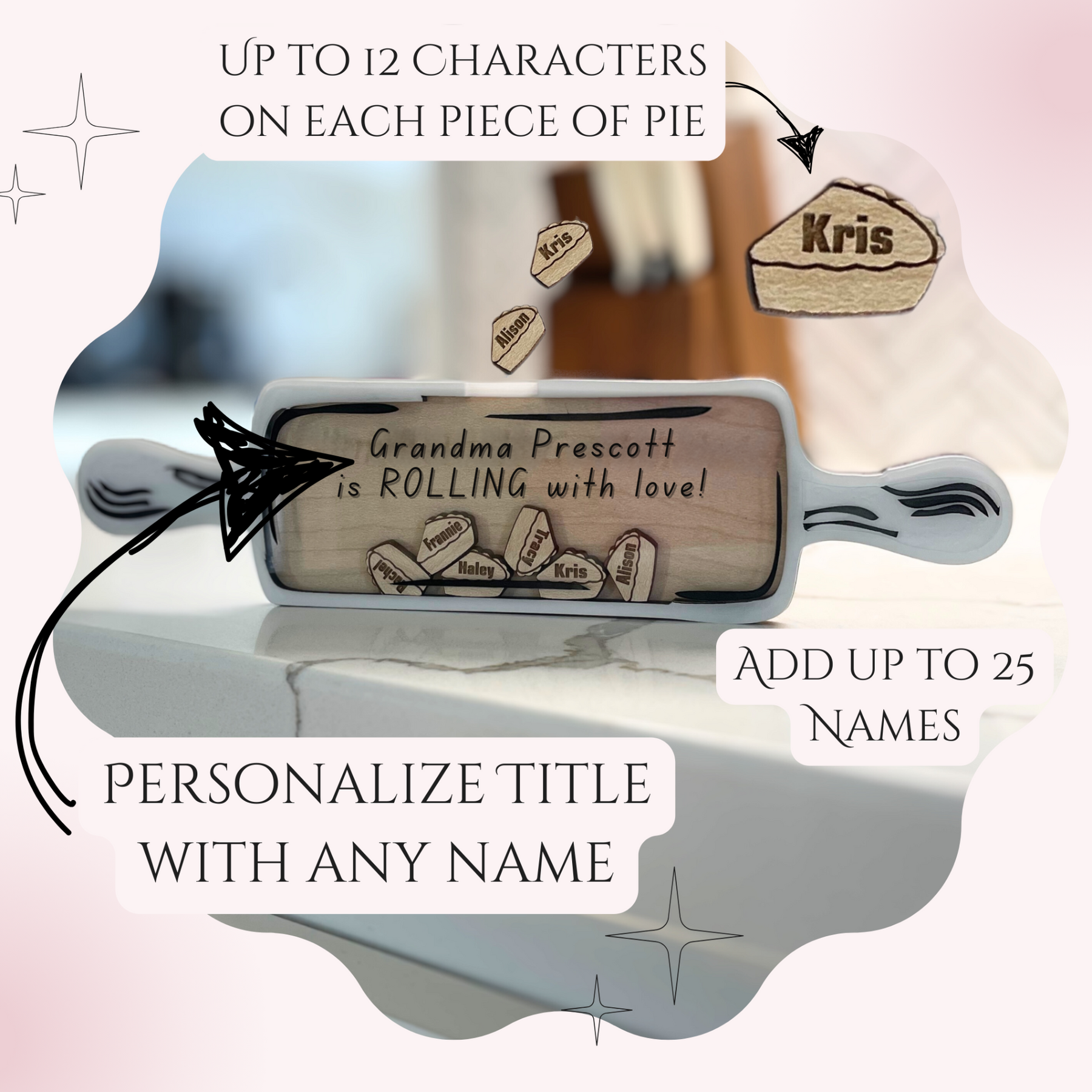 **Listing includes-Rolling pin and up to 25 pieces of pie, with a name on each.