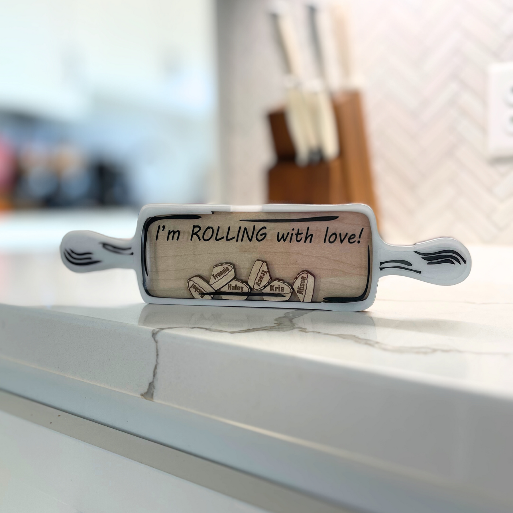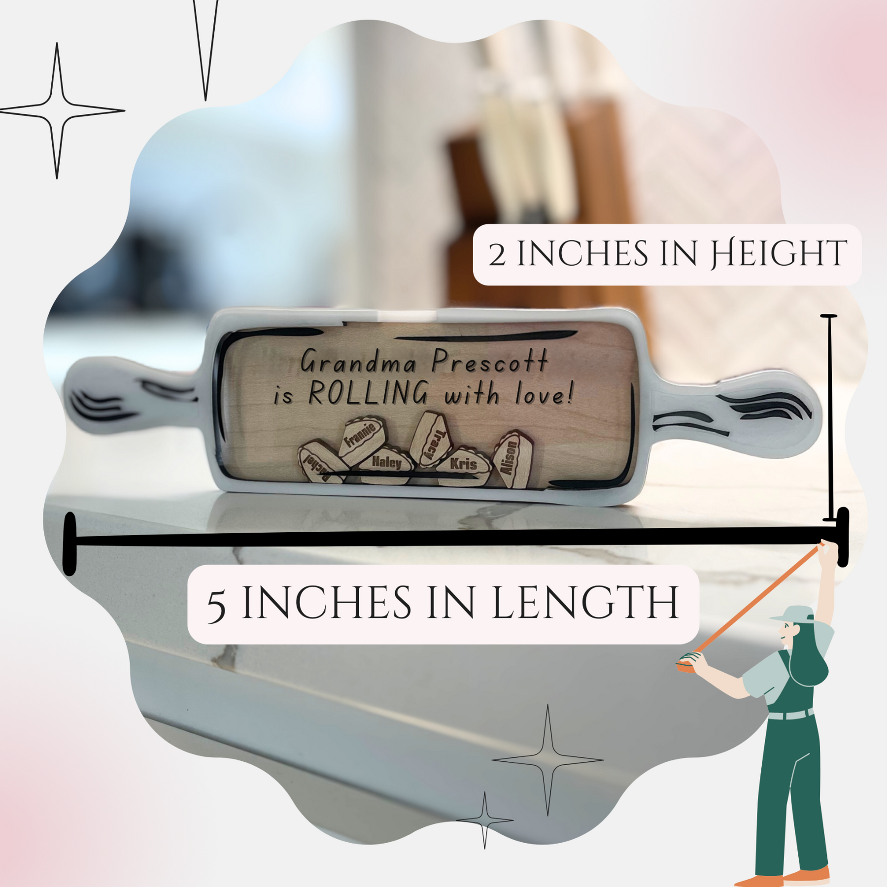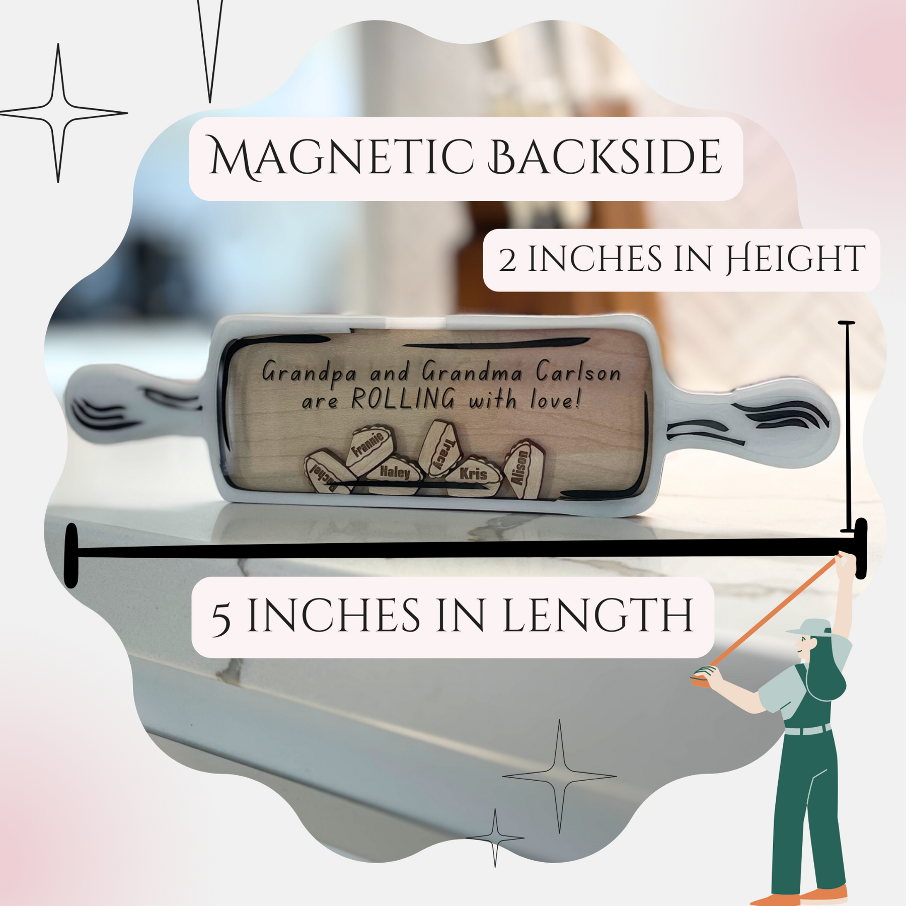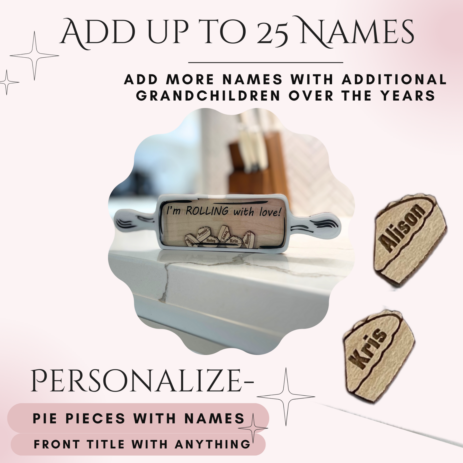 This adorable rolling pin reads "Grandma is rolling with love" (or any special message you pick,) Each piece of pie holds a grandchild's name. The names drop in from a small slot in the top of the magnet. This allows you to add additional names throughout the years. See our separate listing for names only.