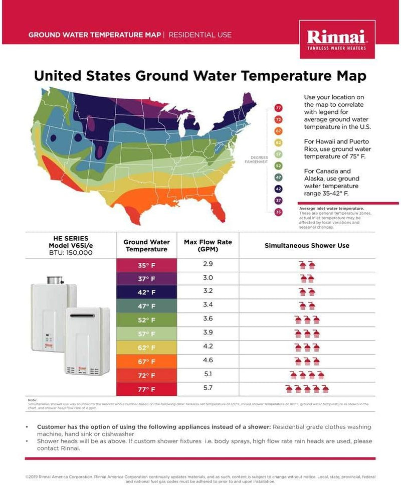 Features ENERGY STAR Qualified Energy Factor of .82 for Natural Gas and Propane Certified for Installation in Manufactured (Mobile) Homes Leak detection shuts off water to unit to limit property damage Enhanced scale detection lessens possibility of serious, long-term damage to unit Temperature lock prevents accidental or unauthorized changes to water temperature Complies with South Coast Air Quality Management District 14 ng/J or 20 ppm NOx emission levels Rinnai Value Series Tankless Water Heater Product Warranty Dimensions Width: 14 Inches Height: 23 Inches Depth: 9 Inches Weight 45.6 Pounds Ignition Direct Electronic Hot Water Capacity 0.26 to 6.6 GPM Minimum Activation Rate 0.4 GPM Minimum/Maximum Gas Rate (Input BTUs ) 10,300 150,000 Energy Factor 0.82 for Natural Gas and Propane Energy Star Yes Approved Gas Types Natural Gas or Propane Temperature Settings 98F - 140F with MC-91-2US 98F - 160F with MCC-91-2US Type of Controller MC-91-2US (included) MCC-91-2US (optional for Hydronic Applications) MC-100V-1US Deluxe Controller (optional) BC-100V-1US Bathroom Controller (optional) Ultra Lox NOx Yes Electrical AC 120 Volts, 60 Hz Electrical Consumption Normal: 76 Watts Standby: 2 Watts Anti-Frost Protection: 120 Watts Service Connections Gas Supply: 3/4 Inch MNPT Cold Water Inlet: 3/4 Inch MNPT Hot Water Outlet: 3/4 Inch MNPT